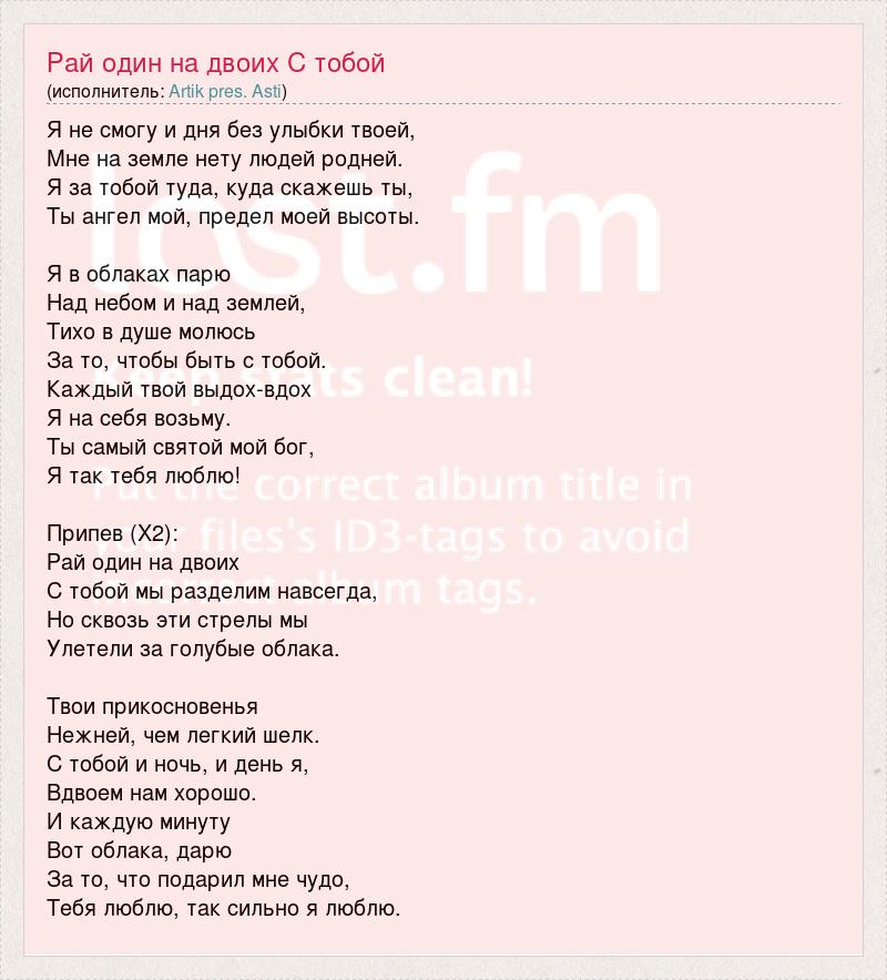 Я не смогу и дня без улыбки твоей, Мне на земле нету людей родней. Я за тобой туда, куда скажешь ты, Ты ангел мой, предел моей высоты. Я в облаках парю Над небом и над землей, Тихо в душе молюсь За то, чтобы быть с тобой. Каждый твой выдох-вдох Я на себя возьму. Ты самый святой мой бог, Я так тебя люблю! Припев (Х2): Рай один на двоих С тобой мы разделим навсегда, Но сквозь эти стрелы мы Улетели за голубые облака. Твои прикосновенья Нежней, чем легкий шелк. С тобой и ночь, и день я, Вдвоем нам хорошо. И каждую минуту Вот облака, дарю За то, что подарил мне чудо, Тебя люблю, так сильно я люблю.