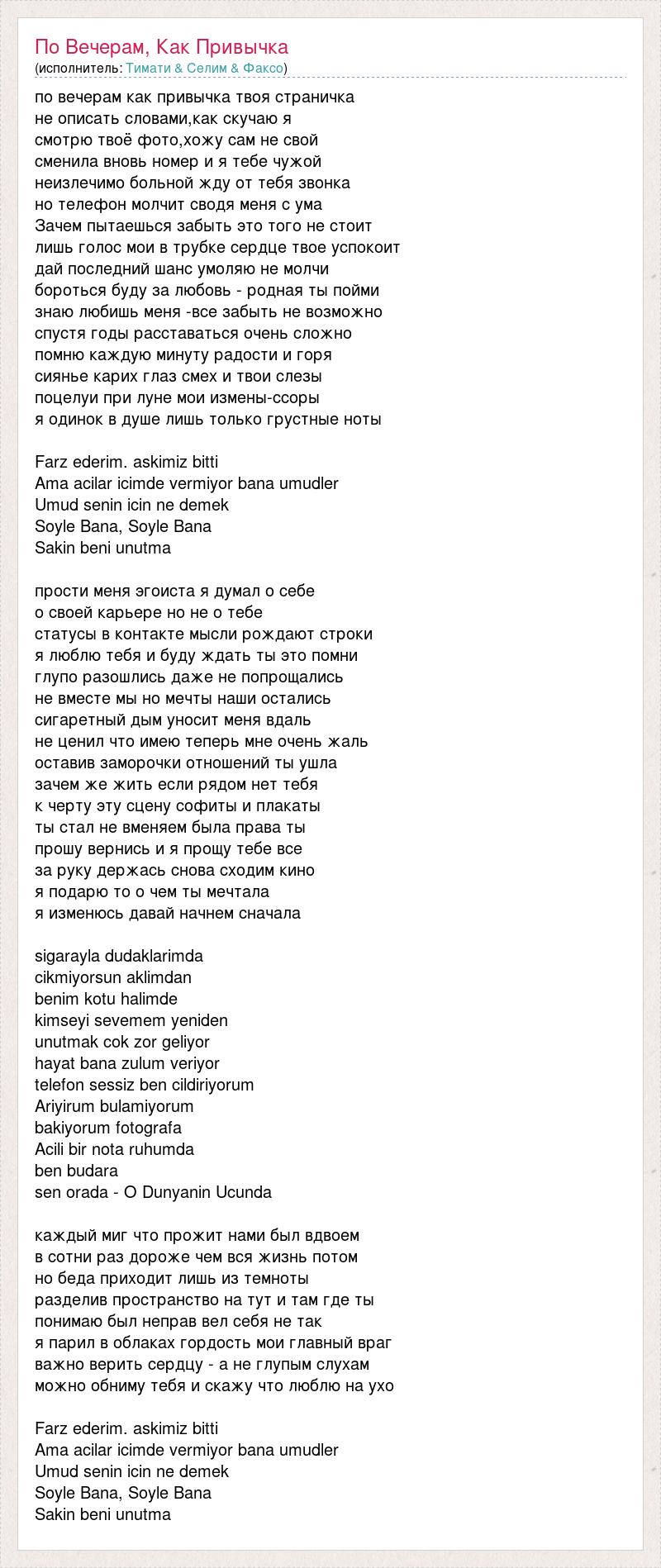 по вечерам как привычка твоя страничка не описать словами,как скучаю я смотрю твоё фото,хожу сам не свой сменила вновь номер и я тебе чужой неизлечимо больной жду от тебя звонка но телефон молчит сводя меня с ума Зачем пытаешься забыть это того не стоит лишь голос мои в трубке сердце твое успокоит дай последний шанс умоляю не молчи бороться буду за любовь - родная ты пойми знаю любишь меня -все забыть не возможно спустя годы расставаться очень сложно помню каждую минуту радости и горя сиянье карих глаз смех и твои слезы поцелуи при луне мои измены-ссоры я одинок в душе лишь только грустные ноты Farz ederim. askimiz bitti Ama acilar icimde vermiyor bana umudler Umud senin icin ne demek Soyle Bana, Soyle Bana Sakin beni unutma прости меня эгоиста я думал о себе о своей карьере но не о тебе статусы в контакте мысли рождают строки я люблю тебя и буду ждать ты это помни глупо разошлись даже не попрощались не вместе мы но мечты наши остались сигаретный дым уносит меня вдаль не ценил что имею теперь мне очень жаль оставив заморочки отношений ты ушла зачем же жить если рядом нет тебя к черту эту сцену софиты и плакаты ты стал не вменяем была права ты прошу вернись и я прощу тебе все за руку держась снова сходим кино я подарю то о чем ты мечтала я изменюсь давай начнем сначала sigarayla dudaklarimda cikmiyorsun aklimdan benim kotu halimde kimseyi sevemem yeniden unutmak cok zor geliyor hayat bana zulum veriyor telefon sessiz ben cildiriyorum Ariyirum bulamiyorum bakiyorum fotografa Acili bir nota ruhumda ben budara sen orada - O Dunyanin Ucunda каждый миг что прожит нами был вдвоем в сотни раз дороже чем вся жизнь потом но беда приходит лишь из темноты разделив пространство на тут и там где ты понимаю был неправ вел себя не так я парил в облаках гордость мои главный враг важно верить сердцу - а не глупым слухам можно обниму тебя и скажу что люблю на ухо Farz ederim. askimiz bitti Ama acilar icimde vermiyor bana umudler Umud senin icin ne demek Soyle Bana, Soyle Bana Sakin beni unutma