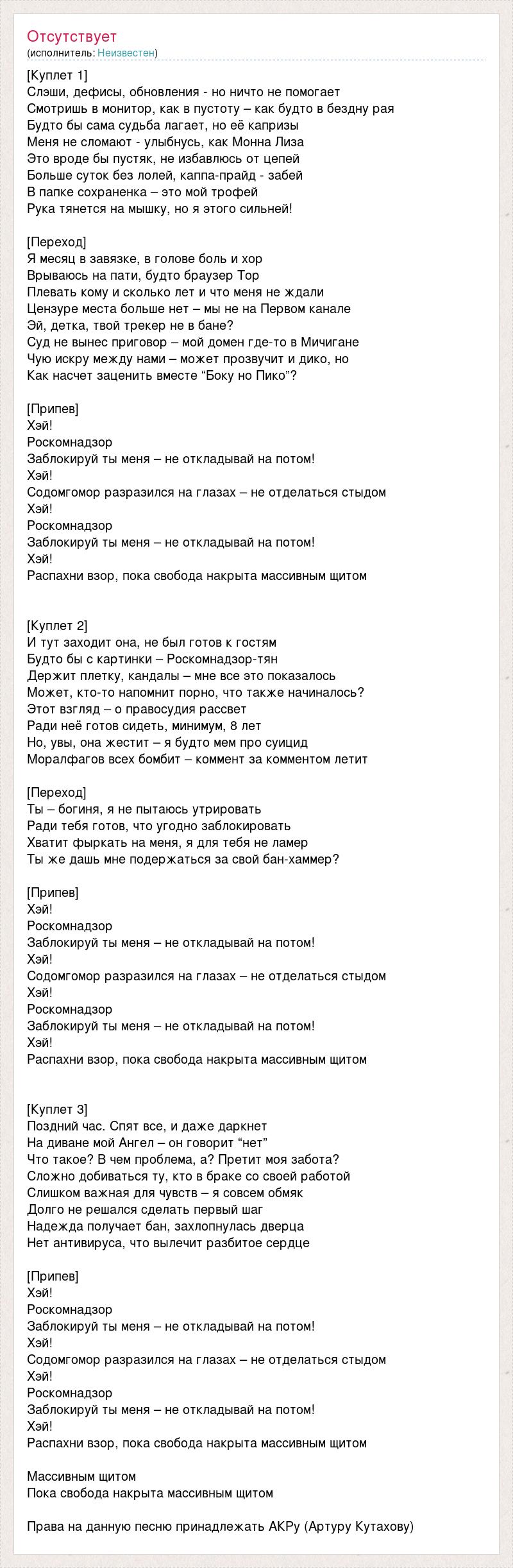 [Куплет 1] Слэши, дефисы, обновления - но ничто не помогает Смотришь в монитор, как в пустоту – как будто в бездну рая Будто бы сама судьба лагает, но её капризы Меня не сломают - улыбнусь, как Монна Лиза Это вроде бы пустяк, не избавлюсь от цепей Больше суток без лолей, каппа-прайд - забей В папке сохраненка – это мой трофей Рука тянется на мышку, но я этого сильней! [Переход] Я месяц в завязке, в голове боль и хор Врываюсь на пати, будто браузер Тор Плевать кому и сколько лет и что меня не ждали Цензуре места больше нет – мы не на Первом канале Эй, детка, твой трекер не в бане? Суд не вынес приговор – мой домен где-то в Мичигане Чую искру между нами – может прозвучит и дико, но Как насчет заценить вместе “Боку но Пико”? [Припев] Хэй! Роскомнадзор Заблокируй ты меня – не откладывай на потом! Хэй! Содомгомор разразился на глазах – не отделаться стыдом Хэй! Роскомнадзор Заблокируй ты меня – не откладывай на потом! Хэй! Распахни взор, пока свобода накрыта массивным щитом [Куплет 2] И тут заходит она, не был готов к гостям Будто бы с картинки – Роскомнадзор-тян Держит плетку, кандалы – мне все это показалось Может, кто-то напомнит порно, что также начиналось? Этот взгляд – о правосудия рассвет Ради неё готов сидеть, минимум, 8 лет Но, увы, она жестит – я будто мем про суицид Моралфагов всех бомбит – коммент за комментом летит [Переход] Ты – богиня, я не пытаюсь утрировать Ради тебя готов, что угодно заблокировать Хватит фыркать на меня, я для тебя не ламер Ты же дашь мне подержаться за свой бан-хаммер? [Припев] Хэй! Роскомнадзор Заблокируй ты меня – не откладывай на потом! Хэй! Содомгомор разразился на глазах – не отделаться стыдом Хэй! Роскомнадзор Заблокируй ты меня – не откладывай на потом! Хэй! Распахни взор, пока свобода накрыта массивным щитом [Куплет 3] Поздний час. Спят все, и даже даркнет На диване мой Ангел – он говорит “нет” Что такое? В чем проблема, а? Претит моя забота? Сложно добиваться ту, кто в браке со своей работой Слишком важная для чувств – я совсем обмяк Долго не решался сделать первый шаг Надежда получает бан, захлопнулась дверца Нет антивируса, что вылечит разбитое сердце [Припев] Хэй! Роскомнадзор Заблокируй ты меня – не откладывай на потом! Хэй! Содомгомор разразился на глазах – не отделаться стыдом Хэй! Роскомнадзор Заблокируй ты меня – не откладывай на потом! Хэй! Распахни взор, пока свобода накрыта массивным щитом Массивным щитом Пока свобода накрыта массивным щитом Права на данную песню принадлежать АКРу (Артуру Кутахову)