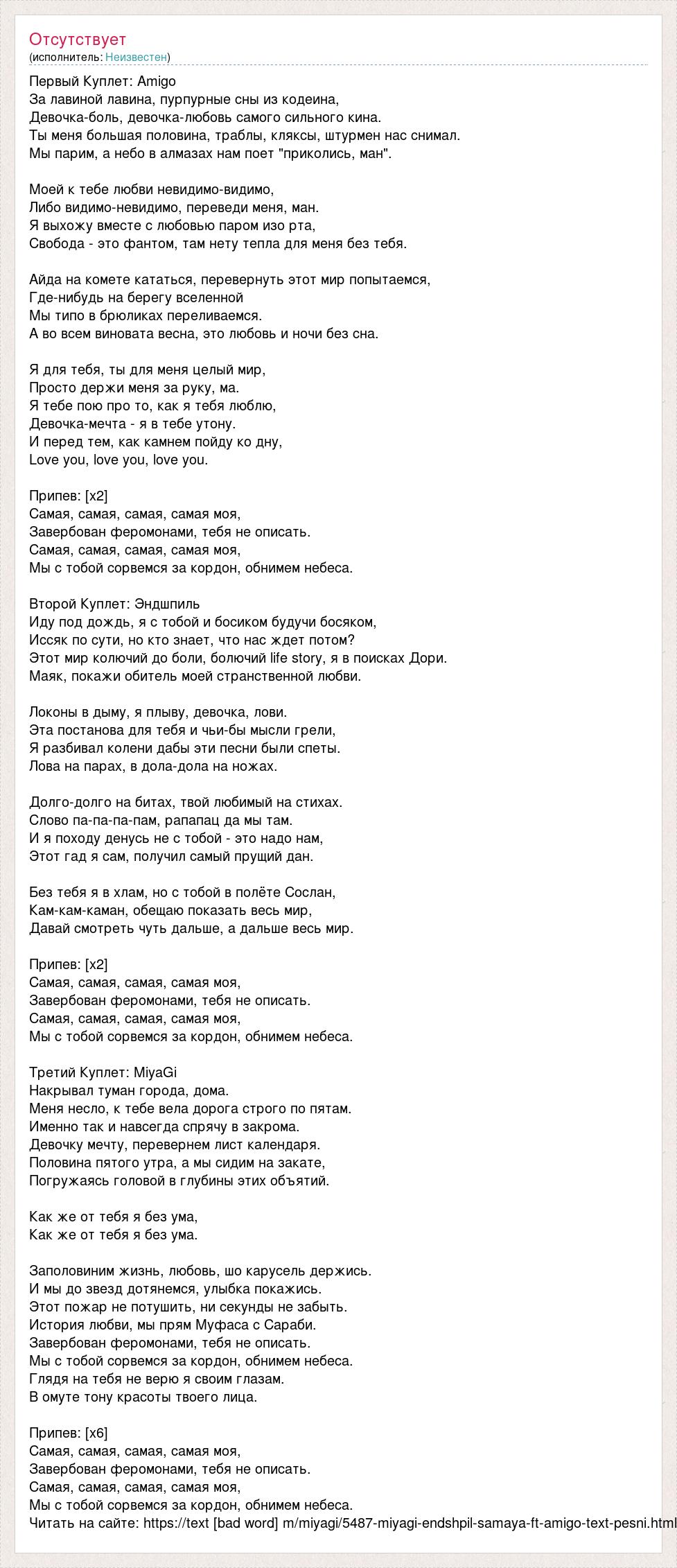Первый Куплет: Amigo За лавиной лавина, пурпурные сны из кодеина, Девочка-боль, девочка-любовь самого сильного кина. Ты меня большая половина, траблы, кляксы, штурмен нас снимал. Мы парим, а небо в алмазах нам поет "приколись, ман". Моей к тебе любви невидимо-видимо, Либо видимо-невидимо, переведи меня, ман. Я выхожу вместе с любовью паром изо рта, Свобода - это фантом, там нету тепла для меня без тебя. Айда на комете кататься, перевернуть этот мир попытаемся, Где-нибудь на берегу вселенной Мы типо в брюликах переливаемся. А во всем виновата весна, это любовь и ночи без сна. Я для тебя, ты для меня целый мир, Просто держи меня за руку, ма. Я тебе пою про то, как я тебя люблю, Девочка-мечта - я в тебе утону. И перед тем, как камнем пойду ко дну, Love you, love you, love you. Припев: [х2] Самая, самая, самая, самая моя, Завербован феромонами, тебя не описать. Самая, самая, самая, самая моя, Мы с тобой сорвемся за кордон, обнимем небеса. Второй Куплет: Эндшпиль Иду под дождь, я с тобой и босиком будучи босяком, Иссяк по сути, но кто знает, что нас ждет потом? Этот мир колючий до боли, болючий life story, я в поисках Дори. Маяк, покажи обитель моей странственной любви. Локоны в дыму, я плыву, девочка, лови. Эта постанова для тебя и чьи-бы мысли грели, Я разбивал колени дабы эти песни были спеты. Лова на парах, в дола-дола на ножах. Долго-долго на битах, твой любимый на стихах. Слово па-па-па-пам, рапапац да мы там. И я походу денусь не с тобой - это надо нам, Этот гад я сам, получил самый прущий дан. Без тебя я в хлам, но с тобой в полёте Сослан, Кам-кам-каман, обещаю показать весь мир, Давай смотреть чуть дальше, а дальше весь мир. Припев: [х2] Самая, самая, самая, самая моя, Завербован феромонами, тебя не описать. Самая, самая, самая, самая моя, Мы с тобой сорвемся за кордон, обнимем небеса. Третий Куплет: MiyaGi Накрывал туман города, дома. Меня несло, к тебе вела дорога строго по пятам. Именно так и навсегда спрячу в закрома. Девочку мечту, перевернем лист календаря. Половина пятого утра, а мы сидим на закате, Погружаясь головой в глубины этих объятий. Как же от тебя я без ума, Как же от тебя я без ума. Заполовиним жизнь, любовь, шо карусель держись. И мы до звезд дотянемся, улыбка покажись. Этот пожар не потушить, ни секунды не забыть. История любви, мы прям Муфаса с Сараби. Завербован феромонами, тебя не описать. Мы с тобой сорвемся за кордон, обнимем небеса. Глядя на тебя не верю я своим глазам. В омуте тону красоты твоего лица. Припев: [х6] Самая, самая, самая, самая моя, Завербован феромонами, тебя не описать. Самая, самая, самая, самая моя, Мы с тобой сорвемся за кордон, обнимем небеса. Читать на сайте: https://text [bad word] m/miyagi/5487-miyagi-endshpil-samaya-ft-amigo-text-pesni.html