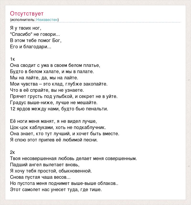 Я у твоих ног, "Спасибо" не говори... В этом тебе помог Бог, Его и благодари... 1к Она сводит с ума в своем белом платье, Будто в белом халате, и мы в палате. Мы на лайте, да, мы на лайте. Мои чувства – это клад, глубже закопайте. Что в её спрайте, вы не узнаете. Прячет грусть под улыбкой, и секрет не в уйте. Градус выше-ниже, лучше не мешайте. 12 ярдов между нами, будто бью пенальти. Её ноги меня манят, я не видел лучше, Цок-цок каблуками, хоть не подкаблучник. Она знает, кто тут лучший, и хочет быть вместе. Я спою этот припев её любимой песни. 2к Твоя несовершенная любовь делает меня совершенным. Падший ангел вылетает вновь, Я хочу тебя простой, обыкновенной. Снова пустая чаша весов... Но пустота меня поднимет выше-выше облаков.. Этот самолет нас унесет туда, где тише.