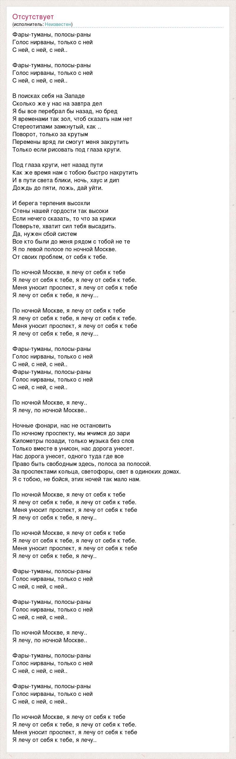 Фары-туманы, полосы-раны Голос нирваны, только с ней С ней, с ней, с ней.. Фары-туманы, полосы-раны Голос нирваны, только с ней С ней, с ней, с ней.. В поисках себя на Западе Сколько же у нас на завтра дел Я бы все перебрал бы назад, но бред Я временами так зол, чтоб сказать нам нет Стереотипами замкнутый, как .. Поворот, только за крутым Перемены вряд ли смогут меня закрутить Только если рисовать под глаза круги. Под глаза круги, нет назад пути Как же время нам с тобою быстро накрутить И в пути света блики, ночь, хаус и дип Дождь до пяти, ложь, дай уйти. И берега терпения высохли Стены нашей гордости так высоки Если нечего сказать, то что за крики Поверьте, хватит сил тебя высадить. Да, нужен сбой систем Все кто были до меня рядом с тобой не те Я по левой полосе по ночной Москве. От своих проблем, от себя к тебе. По ночной Москве, я лечу от себя к тебе Я лечу от себя к тебе, я лечу от себя к тебе. Меня уносит проспект, я лечу от себя к тебе Я лечу от себя к тебе, я лечу... По ночной Москве, я лечу от себя к тебе Я лечу от себя к тебе, я лечу от себя к тебе. Меня уносит проспект, я лечу от себя к тебе Я лечу от себя к тебе, я лечу... Фары-туманы, полосы-раны Голос нирваны, только с ней С ней, с ней, с ней.. Фары-туманы, полосы-раны Голос нирваны, только с ней С ней, с ней, с ней.. По ночной Москве, я лечу.. Я лечу, по ночной Москве.. Ночные фонари, нас не остановить По ночному проспекту, мы мчимся до зари Километры позади, только музыка без слов Только вместе в унисон, нас дорога унесет. Нас дорога унесет, одного туда где все Право быть свободным здесь, полоса за полосой. За проспектами кольца, светофоры, свет в одиноких домах. Я с тобою, не бойся, этих ночей так мало нам. По ночной Москве, я лечу от себя к тебе Я лечу от себя к тебе, я лечу от себя к тебе. Меня уносит проспект, я лечу от себя к тебе Я лечу от себя к тебе, я лечу.. По ночной Москве, я лечу от себя к тебе Я лечу от себя к тебе, я лечу от себя к тебе. Меня уносит проспект, я лечу от себя к тебе Я лечу от себя к тебе, я лечу.. Фары-туманы, полосы-раны Голос нирваны, только с ней С ней, с ней, с ней.. Фары-туманы, полосы-раны Голос нирваны, только с ней С ней, с ней, с ней.. По ночной Москве, я лечу.. Я лечу, по ночной Москве.. Фары-туманы, полосы-раны Голос нирваны, только с ней С ней, с ней, с ней.. Фары-туманы, полосы-раны Голос нирваны, только с ней С ней, с ней, с ней.. По ночной Москве, я лечу от себя к тебе Я лечу от себя к тебе, я лечу от себя к тебе. Меня уносит проспект, я лечу от себя к тебе Я лечу от себя к тебе, я лечу..