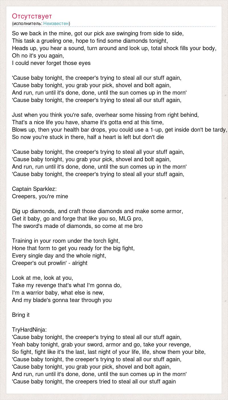 So we back in the mine, got our pick axe swinging from side to side, This task a grueling one, hope to find some diamonds tonight, Heads up, you hear a sound, turn around and look up, total shock fills your body, Oh no it's you again, I could never forget those eyes 'Cause baby tonight, the creeper's trying to steal all our stuff again, 'Cause baby tonight, you grab your pick, shovel and bolt again, And run, run until it's done, done, until the sun comes up in the morn' 'Cause baby tonight, the creeper's trying to steal all our stuff again, Just when you think you're safe, overhear some hissing from right behind, That's a nice life you have, shame it's gotta end at this time, Blows up, then your health bar drops, you could use a 1-up, get inside don't be tardy, So now you're stuck in there, half a heart is left but don't die 'Cause baby tonight, the creeper's trying to steal all your stuff again, 'Cause baby tonight, you grab your pick, shovel and bolt again, And run, run until it's done, done, until the sun comes up in the morn' 'Cause baby tonight, the creeper's trying to steal all your stuff again, Captain Sparklez: Creepers, you're mine Dig up diamonds, and craft those diamonds and make some armor, Get it baby, go and forge that like you so, MLG pro, The sword's made of diamonds, so come at me bro Training in your room under the torch light, Hone that form to get you ready for the big fight, Every single day and the whole night, Creeper's out prowlin' - alright Look at me, look at you, Take my revenge that's what I'm gonna do, I'm a warrior baby, what else is new, And my blade's gonna tear through you Bring it TryHardNinja: 'Cause baby tonight, the creeper's trying to steal all our stuff again, Yeah baby tonight, grab your sword, armor and go, take your revenge, So fight, fight like it's the last, last night of your life, life, show them your bite, 'Cause baby tonight, the creeper's trying to steal all our stuff again, 'Cause baby tonight, you grab your pick, shovel and bolt again, And run, run until it's done, done, until the sun comes up in the morn' 'Cause baby tonight, the creepers tried to steal all our stuff again