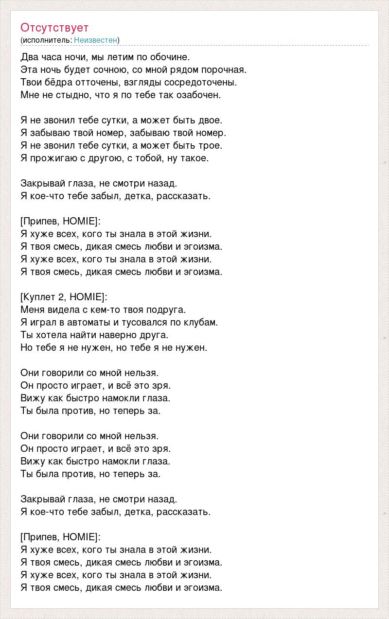 Два часа ночи, мы летим по обочине. Эта ночь будет сочною, со мной рядом порочная. Твои бёдра отточены, взгляды сосредоточены. Мне не стыдно, что я по тебе так озабочен. Я не звонил тебе сутки, а может быть двое. Я забываю твой номер, забываю твой номер. Я не звонил тебе сутки, а может быть трое. Я прожигаю с другою, с тобой, ну такое. Закрывай глаза, не смотри назад. Я кое-что тебе забыл, детка, рассказать. [Припев, HOMIE]: Я хуже всех, кого ты знала в этой жизни. Я твоя смесь, дикая смесь любви и эгоизма. Я хуже всех, кого ты знала в этой жизни. Я твоя смесь, дикая смесь любви и эгоизма. [Куплет 2, HOMIE]: Меня видела с кем-то твоя подруга. Я играл в автоматы и тусовался по клубам. Ты хотела найти наверно друга. Но тебе я не нужен, но тебе я не нужен. Они говорили со мной нельзя. Он просто играет, и всё это зря. Вижу как быстро намокли глаза. Ты была против, но теперь за. Они говорили со мной нельзя. Он просто играет, и всё это зря. Вижу как быстро намокли глаза. Ты была против, но теперь за. Закрывай глаза, не смотри назад. Я кое-что тебе забыл, детка, рассказать. [Припев, HOMIE]: Я хуже всех, кого ты знала в этой жизни. Я твоя смесь, дикая смесь любви и эгоизма. Я хуже всех, кого ты знала в этой жизни. Я твоя смесь, дикая смесь любви и эгоизма.
