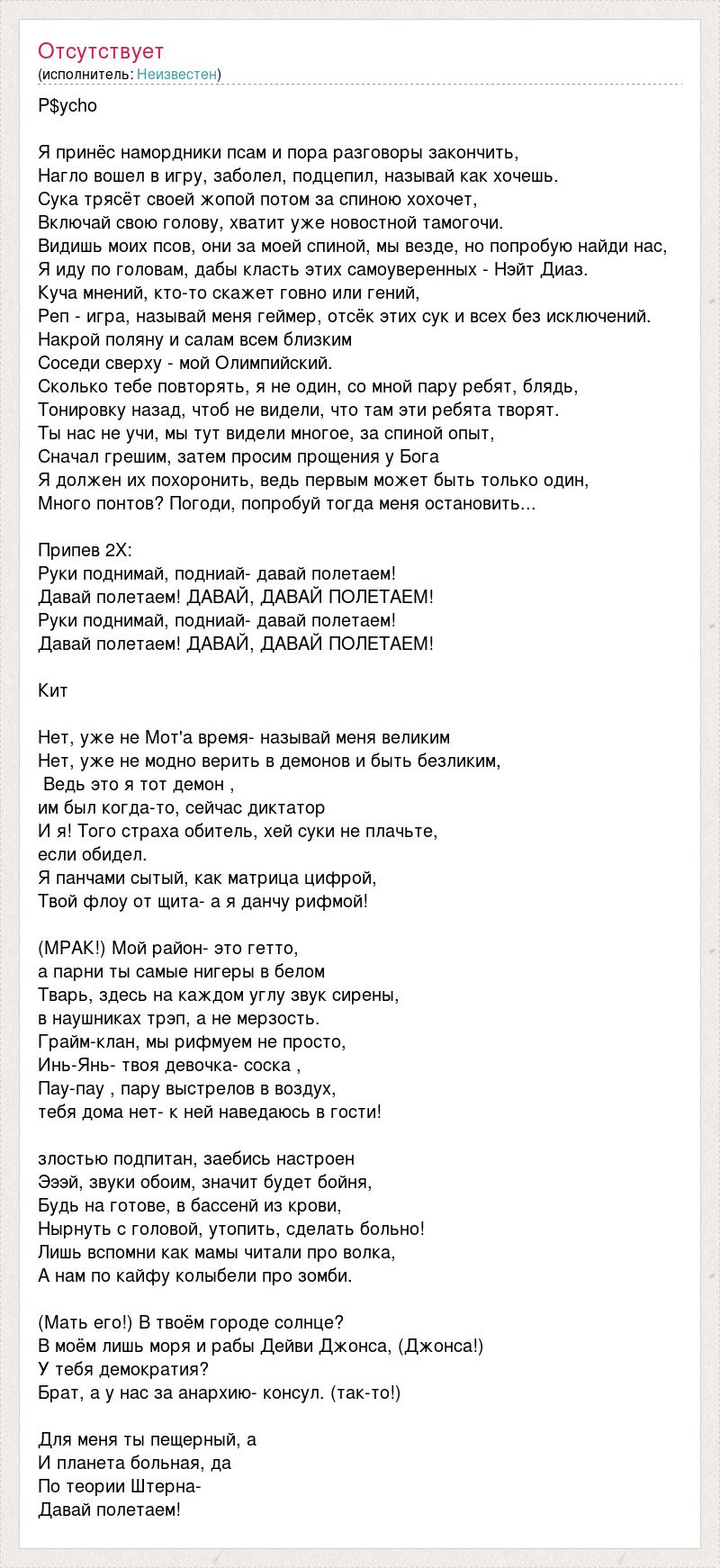 P$ycho Я принёс намордники псам и пора разговоры закончить, Нагло вошел в игру, заболел, подцепил, называй как хочешь. Сука трясёт своей жопой потом за спиною хохочет, Включай свою голову, хватит уже новостной тамогочи. Видишь моих псов, они за моей спиной, мы везде, но попробую найди нас, Я иду по головам, дабы класть этих самоуверенных - Нэйт Диаз. Куча мнений, кто-то скажет говно или гений, Реп - игра, называй меня геймер, отсёк этих сук и всех без исключений. Накрой поляну и салам всем близким Соседи сверху - мой Олимпийский. Сколько тебе повторять, я не один, со мной пару ребят, блядь, Тонировку назад, чтоб не видели, что там эти ребята творят. Ты нас не учи, мы тут видели многое, за спиной опыт, Сначал грешим, затем просим прощения у Бога Я должен их похоронить, ведь первым может быть только один, Много понтов? Погоди, попробуй тогда меня остановить... Припев 2Х: Руки поднимай, подниай- давай полетаем! Давай полетаем! ДАВАЙ, ДАВАЙ ПОЛЕТАЕМ! Руки поднимай, подниай- давай полетаем! Давай полетаем! ДАВАЙ, ДАВАЙ ПОЛЕТАЕМ! Кит Нет, уже не Мот'а время- называй меня великим Нет, уже не модно верить в демонов и быть безликим, Ведь это я тот демон , им был когда-то, сейчас диктатор И я! Того страха обитель, хей суки не плачьте, если обидел. Я панчами сытый, как матрица цифрой, Твой флоу от щита- а я данчу рифмой! (МРАК!) Мой район- это гетто, а парни ты самые нигеры в белом Тварь, здесь на каждом углу звук сирены, в наушниках трэп, а не мерзость. Грайм-клан, мы рифмуем не просто, Инь-Янь- твоя девочка- соска , Пау-пау , пару выстрелов в воздух, тебя дома нет- к ней наведаюсь в гости! злостью подпитан, заебись настроен Эээй, звуки обоим, значит будет бойня, Будь на готове, в бассенй из крови, Нырнуть с головой, утопить, сделать больно! Лишь вспомни как мамы читали про волка, А нам по кайфу колыбели про зомби. (Мать его!) В твоём городе солнце? В моём лишь моря и рабы Дейви Джонса, (Джонса!) У тебя демократия? Брат, а у нас за анархию- консул. (так-то!) Для меня ты пещерный, а И планета больная, да По теории Штерна- Давай полетаем!