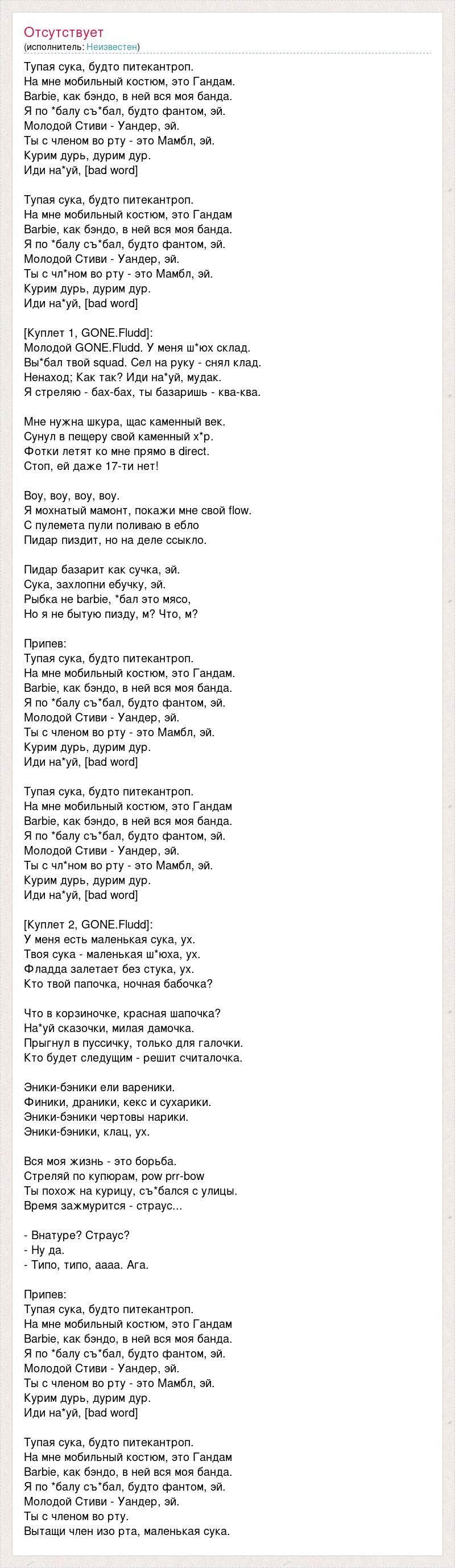 Тупая сука, будто питекантроп. На мне мобильный костюм, это Гандам. Barbie, как бэндо, в ней вся моя банда. Я по *балу съ*бал, будто фантом, эй. Молодой Стиви - Уандер, эй. Ты с членом во рту - это Мамбл, эй. Курим дурь, дурим дур. Иди на*уй, [bad word] Тупая сука, будто питекантроп. На мне мобильный костюм, это Гандам Barbie, как бэндо, в ней вся моя банда. Я по *балу съ*бал, будто фантом, эй. Молодой Стиви - Уандер, эй. Ты с чл*ном во рту - это Мамбл, эй. Курим дурь, дурим дур. Иди на*уй, [bad word] [Куплет 1, GONE.Fludd]: Молодой GONE.Fludd. У меня ш*юх склад. Вы*бал твой squad. Сел на руку - снял клад. Ненаход; Как так? Иди на*уй, мудак. Я стреляю - бах-бах, ты базаришь - ква-ква. Мне нужна шкура, щас каменный век. Сунул в пещеру свой каменный х*р. Фотки летят ко мне прямо в direct. Стоп, ей даже 17-ти нет! Воу, воу, воу, воу. Я мохнатый мамонт, покажи мне свой flow. С пулемета пули поливаю в ебло Пидар пиздит, но на деле ссыкло. Пидар базарит как сучка, эй. Сука, захлопни ебучку, эй. Рыбка не barbie, *бал это мясо, Но я не бытую пизду, м? Что, м? Припев: Тупая сука, будто питекантроп. На мне мобильный костюм, это Гандам. Barbie, как бэндо, в ней вся моя банда. Я по *балу съ*бал, будто фантом, эй. Молодой Стиви - Уандер, эй. Ты с членом во рту - это Мамбл, эй. Курим дурь, дурим дур. Иди на*уй, [bad word] Тупая сука, будто питекантроп. На мне мобильный костюм, это Гандам Barbie, как бэндо, в ней вся моя банда. Я по *балу съ*бал, будто фантом, эй. Молодой Стиви - Уандер, эй. Ты с чл*ном во рту - это Мамбл, эй. Курим дурь, дурим дур. Иди на*уй, [bad word] [Куплет 2, GONE.Fludd]: У меня есть маленькая сука, ух. Твоя сука - маленькая ш*юха, ух. Фладда залетает без стука, ух. Кто твой папочка, ночная бабочка? Что в корзиночке, красная шапочка? На*уй сказочки, милая дамочка. Прыгнул в пуссичку, только для галочки. Кто будет следущим - решит считалочка. Эники-бэники ели вареники. Финики, драники, кекс и сухарики. Эники-бэники чертовы нарики. Эники-бэники, клац, ух. Вся моя жизнь - это борьба. Стреляй по купюрам, pow prr-bow Ты похож на курицу, съ*бался с улицы. Время зажмурится - страус... - Внатуре? Страус? - Ну да. - Типо, типо, аааа. Ага. Припев: Тупая сука, будто питекантроп. На мне мобильный костюм, это Гандам Barbie, как бэндо, в ней вся моя банда. Я по *балу съ*бал, будто фантом, эй. Молодой Стиви - Уандер, эй. Ты с членом во рту - это Мамбл, эй. Курим дурь, дурим дур. Иди на*уй, [bad word] Тупая сука, будто питекантроп. На мне мобильный костюм, это Гандам Barbie, как бэндо, в ней вся моя банда. Я по *балу съ*бал, будто фантом, эй. Молодой Стиви - Уандер, эй. Ты с членом во рту. Вытащи член изо рта, маленькая сука.