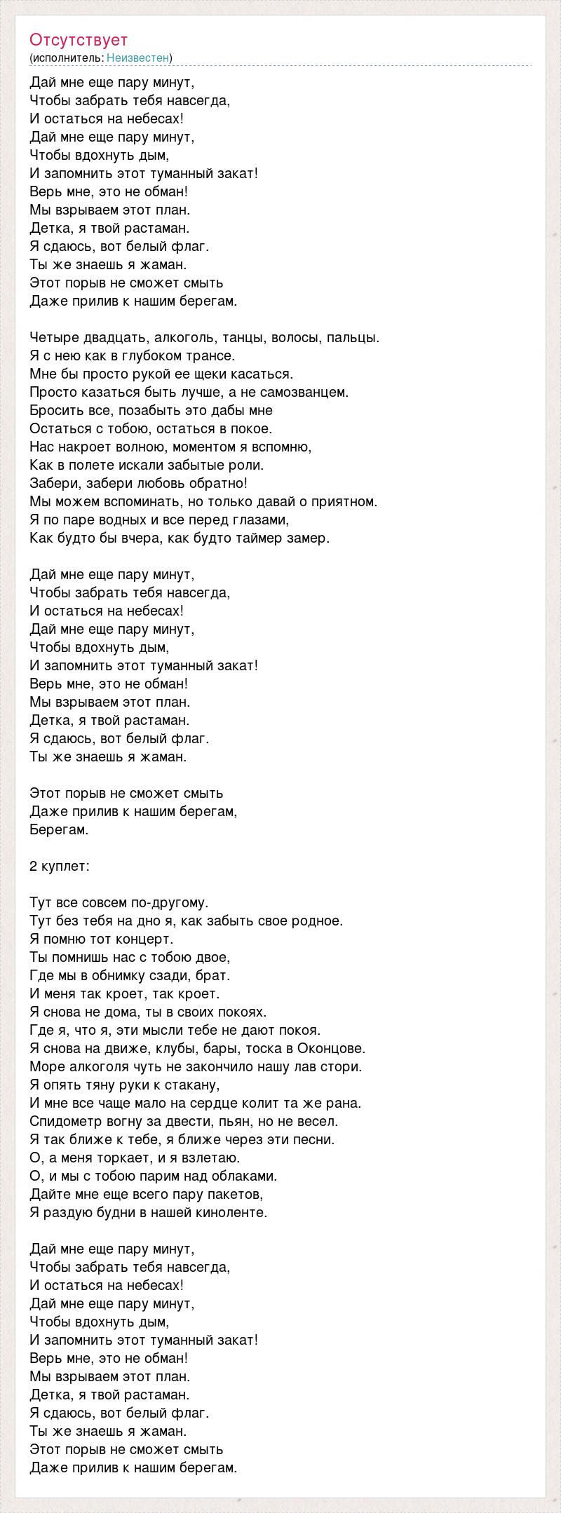 Дай мне еще пару минут, Чтобы забрать тебя навсегда, И остаться на небесах! Дай мне еще пару минут, Чтобы вдохнуть дым, И запомнить этот туманный закат! Верь мне, это не обман! Мы взрываем этот план. Детка, я твой растаман. Я сдаюсь, вот белый флаг. Ты же знаешь я жаман. Этот порыв не сможет смыть Даже прилив к нашим берегам. Четыре двадцать, алкоголь, танцы, волосы, пальцы. Я с нею как в глубоком трансе. Мне бы просто рукой ее щеки касаться. Просто казаться быть лучше, а не самозванцем. Бросить все, позабыть это дабы мне Остаться с тобою, остаться в покое. Нас накроет волною, моментом я вспомню, Как в полете искали забытые роли. Забери, забери любовь обратно! Мы можем вспоминать, но только давай о приятном. Я по паре водных и все перед глазами, Как будто бы вчера, как будто таймер замер. Дай мне еще пару минут, Чтобы забрать тебя навсегда, И остаться на небесах! Дай мне еще пару минут, Чтобы вдохнуть дым, И запомнить этот туманный закат! Верь мне, это не обман! Мы взрываем этот план. Детка, я твой растаман. Я сдаюсь, вот белый флаг. Ты же знаешь я жаман. Этот порыв не сможет смыть Даже прилив к нашим берегам, Берегам. 2 куплет: Тут все совсем по-другому. Тут без тебя на дно я, как забыть свое родное. Я помню тот концерт. Ты помнишь нас с тобою двое, Где мы в обнимку сзади, брат. И меня так кроет, так кроет. Я снова не дома, ты в своих покоях. Где я, что я, эти мысли тебе не дают покоя. Я снова на движе, клубы, бары, тоска в Оконцове. Море алкоголя чуть не закончило нашу лав стори. Я опять тяну руки к стакану, И мне все чаще мало на сердце колит та же рана. Спидометр вогну за двести, пьян, но не весел. Я так ближе к тебе, я ближе через эти песни. О, а меня торкает, и я взлетаю. О, и мы с тобою парим над облаками. Дайте мне еще всего пару пакетов, Я раздую будни в нашей киноленте. Дай мне еще пару минут, Чтобы забрать тебя навсегда, И остаться на небесах! Дай мне еще пару минут, Чтобы вдохнуть дым, И запомнить этот туманный закат! Верь мне, это не обман! Мы взрываем этот план. Детка, я твой растаман. Я сдаюсь, вот белый флаг. Ты же знаешь я жаман. Этот порыв не сможет смыть Даже прилив к нашим берегам.