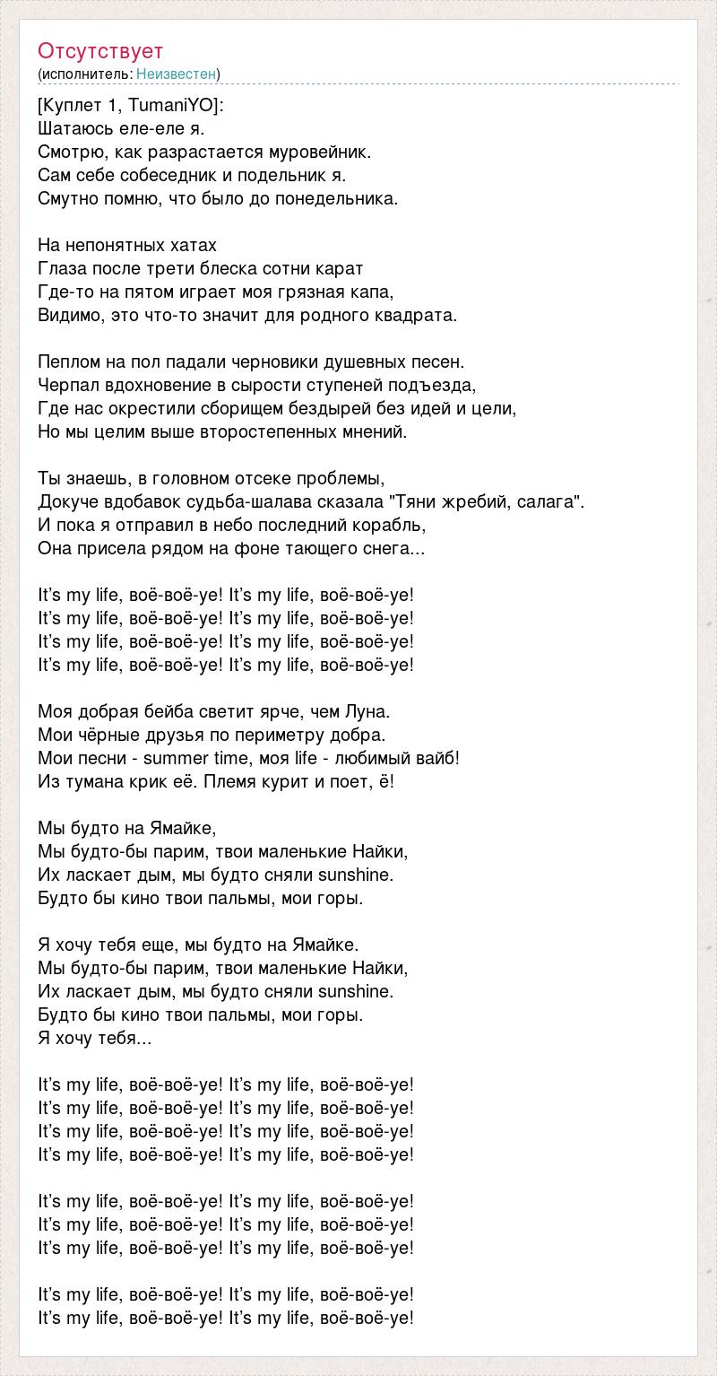 [Куплет 1, TumaniYO]: Шатаюсь еле-еле я. Смотрю, как разрастается муровейник. Сам себе собеседник и подельник я. Смутно помню, что было до понедельника. На непонятных хатах Глаза после трети блеска сотни карат Где-то на пятом играет моя грязная капа, Видимо, это что-то значит для родного квадрата. Пеплом на пол падали черновики душевных песен. Черпал вдохновение в сырости ступеней подъезда, Где нас окрестили сборищем бездырей без идей и цели, Но мы целим выше второстепенных мнений. Ты знаешь, в головном отсеке проблемы, Докуче вдобавок судьба-шалава сказала "Тяни жребий, салага". И пока я отправил в небо последний корабль, Она присела рядом на фоне тающего снега... It’s my life, воё-воё-уе! It’s my life, воё-воё-уе! It’s my life, воё-воё-уе! It’s my life, воё-воё-уе! It’s my life, воё-воё-уе! It’s my life, воё-воё-уе! It’s my life, воё-воё-уе! It’s my life, воё-воё-уе! Моя добрая бейба светит ярче, чем Луна. Мои чёрные друзья по периметру добра. Мои песни - summer time, моя life - любимый вайб! Из тумана крик её. Племя курит и поет, ё! Мы будто на Ямайке, Мы будто-бы парим, твои маленькие Найки, Их ласкает дым, мы будто сняли sunshine. Будто бы кино твои пальмы, мои горы. Я хочу тебя еще, мы будто на Ямайке. Мы будто-бы парим, твои маленькие Найки, Их ласкает дым, мы будто сняли sunshine. Будто бы кино твои пальмы, мои горы. Я хочу тебя... It’s my life, воё-воё-уе! It’s my life, воё-воё-уе! It’s my life, воё-воё-уе! It’s my life, воё-воё-уе! It’s my life, воё-воё-уе! It’s my life, воё-воё-уе! It’s my life, воё-воё-уе! It’s my life, воё-воё-уе! It’s my life, воё-воё-уе! It’s my life, воё-воё-уе! It’s my life, воё-воё-уе! It’s my life, воё-воё-уе! It’s my life, воё-воё-уе! It’s my life, воё-воё-уе! It’s my life, воё-воё-уе! It’s my life, воё-воё-уе! It’s my life, воё-воё-уе! It’s my life, воё-воё-уе!