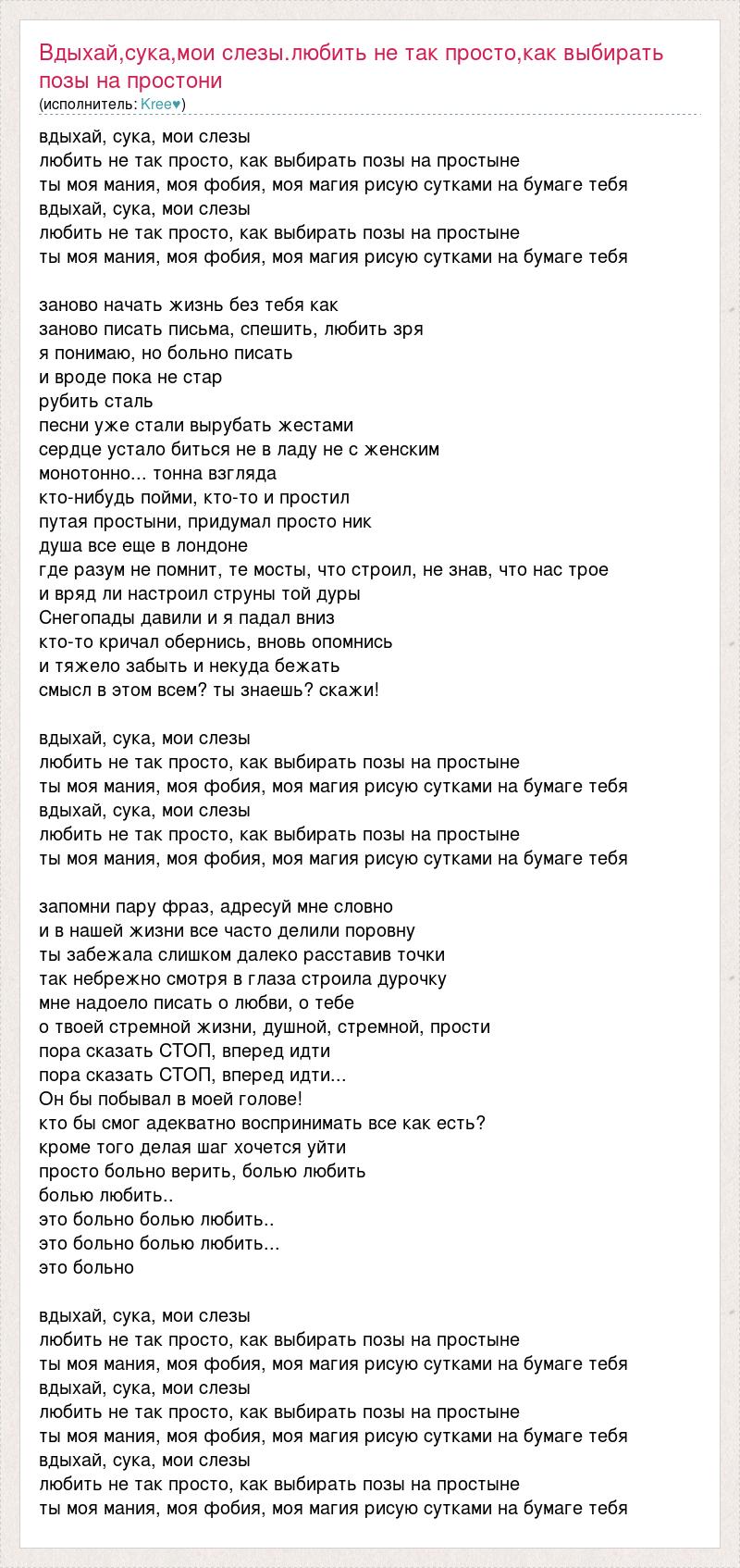 вдыхай, сука, мои слезы любить не так просто, как выбирать позы на простыне ты моя мания, моя фобия, моя магия рисую сутками на бумаге тебя вдыхай, сука, мои слезы любить не так просто, как выбирать позы на простыне ты моя мания, моя фобия, моя магия рисую сутками на бумаге тебя заново начать жизнь без тебя как заново писать письма, спешить, любить зря я понимаю, но больно писать и вроде пока не стар рубить сталь песни уже стали вырубать жестами сердце устало биться не в ладу не с женским монотонно... тонна взгляда кто-нибудь пойми, кто-то и простил путая простыни, придумал просто ник душа все еще в лондоне где разум не помнит, те мосты, что строил, не знав, что нас трое и вряд ли настроил струны той дуры Снегопады давили и я падал вниз кто-то кричал обернись, вновь опомнись и тяжело забыть и некуда бежать смысл в этом всем? ты знаешь? скажи! вдыхай, сука, мои слезы любить не так просто, как выбирать позы на простыне ты моя мания, моя фобия, моя магия рисую сутками на бумаге тебя вдыхай, сука, мои слезы любить не так просто, как выбирать позы на простыне ты моя мания, моя фобия, моя магия рисую сутками на бумаге тебя запомни пару фраз, адресуй мне словно и в нашей жизни все часто делили поровну ты забежала слишком далеко расставив точки так небрежно смотря в глаза строила дурочку мне надоело писать о любви, о тебе о твоей стремной жизни, душной, стремной, прости пора сказать СТОП, вперед идти пора сказать СТОП, вперед идти... Он бы побывал в моей голове! кто бы смог адекватно воспринимать все как есть? кроме того делая шаг хочется уйти просто больно верить, болью любить болью любить.. это больно болью любить.. это больно болью любить... это больно вдыхай, сука, мои слезы любить не так просто, как выбирать позы на простыне ты моя мания, моя фобия, моя магия рисую сутками на бумаге тебя вдыхай, сука, мои слезы любить не так просто, как выбирать позы на простыне ты моя мания, моя фобия, моя магия рисую сутками на бумаге тебя вдыхай, сука, мои слезы любить не так просто, как выбирать позы на простыне ты моя мания, моя фобия, моя магия рисую сутками на бумаге тебя