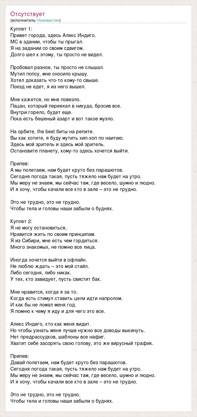 Куплет 1: Привет города, здесь Алекс Индиго. МС в здании, чтобы ты прыгал. Я на задании со своим сдвигом. Долго шел к этому, ты просто не видел. Пробовал разное, ты просто не слышал. Мутил попсу, мне сносило крышу. Хотел доказать что-то кому-то свыше. Поезд не едет, я из него вышел. Мне кажется, но мне повезло. Пацан, который переехал в никуда, бросив все. Внутри горело, будет еще. Пока есть бешеный азарт и вот такое музло. На орбите, the best биты на репите. Вы как хотите, я буду мутить хип-хоп по наитию. Здесь мой зритель и здесь мой зритель. Остановите планету, кому-то здесь хочется выйти. Припев: А мы полетаем, нам будет круто без парашютов. Сегодня погода такая, пусть тяжело нам будет на утро. Мы меру не знаем, мы сейчас там, где весело, шумно и людно. И я хочу, чтобы качали все кто в зале – это не трудно. Это не трудно, это не трудно. Чтобы тела и головы наши забыли о буднях. Куплет 2: Я не могу остановиться, Нравится жить по своим принципам. Я из Сибири, мне есть чем гордиться. Много знакомых, не помню все лица. Иногда хочется выйти в офлайн. Не люблю ждать – это мой стайл. Либо сегодня, либо никак. У тех, кто завидует, пусть свистит бак. Мне нравится, когда я за то. Когда есть стимул ставить цели идти напролом. И как бы не ломал меня год. Я помню к чему я иду и для чего это все. Алекс Индиго, кто как меня видит. Но чтобы узнать меня лучше нужно все доводы выкинуть. Нет предрассудков, шаблоны все нафиг. Хватит себе засорять свою голову, это же вирусный трафик. Припев: Давай полетаем, нам будет круто без парашютов. Сегодня погода такая, пусть тяжело нам будет на утро. Мы меру не знаем, мы сейчас там, где весело, шумно и людно. И я хочу, чтобы качали все кто в зале – это не трудно. Это не трудно, это не трудно. Чтобы тела и головы наши забыли о буднях.