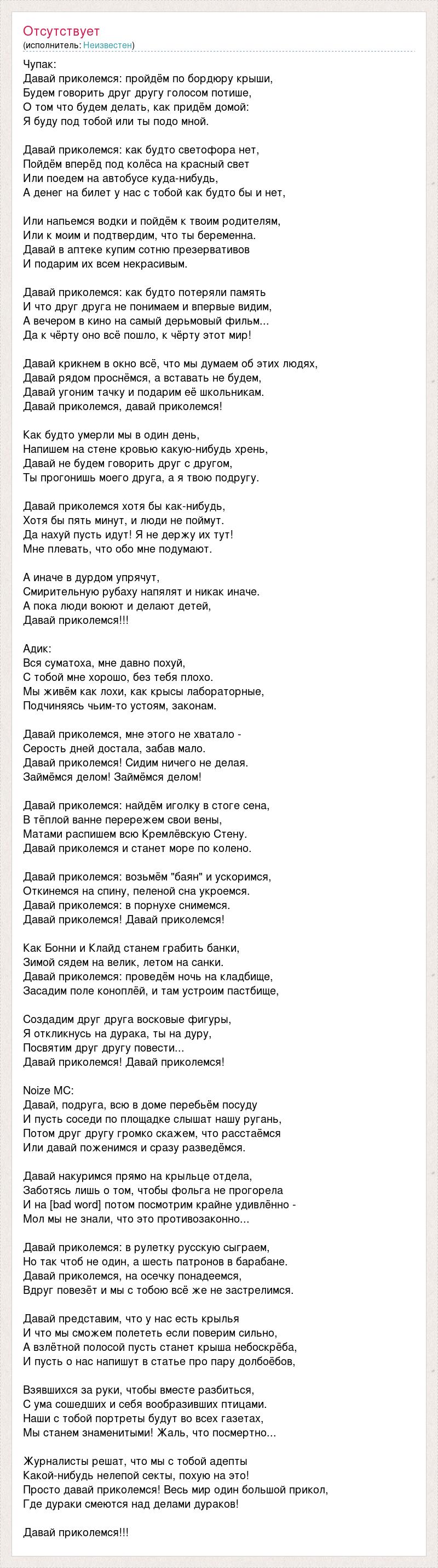 Чупак: Давай приколемся: пройдём по бордюру крыши, Будем говорить друг другу голосом потише, О том что будем делать, как придём домой: Я буду под тобой или ты подо мной. Давай приколемся: как будто светофора нет, Пойдём вперёд под колёса на красный свет Или поедем на автобусе куда-нибудь, А денег на билет у нас с тобой как будто бы и нет, Или напьемся водки и пойдём к твоим родителям, Или к моим и подтвердим, что ты беременна. Давай в аптеке купим сотню презервативов И подарим их всем некрасивым. Давай приколемся: как будто потеряли память И что друг друга не понимаем и впервые видим, А вечером в кино на самый дерьмовый фильм... Да к чёрту оно всё пошло, к чёрту этот мир! Давай крикнем в окно всё, что мы думаем об этих людях, Давай рядом проснёмся, а вставать не будем, Давай угоним тачку и подарим её школьникам. Давай приколемся, давай приколемся! Как будто умерли мы в один день, Напишем на стене кровью какую-нибудь хрень, Давай не будем говорить друг с другом, Ты прогонишь моего друга, а я твою подругу. Давай приколемся хотя бы как-нибудь, Хотя бы пять минут, и люди не поймут. Да нахуй пусть идут! Я не держу их тут! Мне плевать, что обо мне подумают. А иначе в дурдом упрячут, Смирительную рубаху напялят и никак иначе. А пока люди воюют и делают детей, Давай приколемся!!! Адик: Вся суматоха, мне давно похуй, С тобой мне хорошо, без тебя плохо. Мы живём как лохи, как крысы лабораторные, Подчиняясь чьим-то устоям, законам. Давай приколемся, мне этого не хватало - Серость дней достала, забав мало. Давай приколемся! Сидим ничего не делая. Займёмся делом! Займёмся делом! Давай приколемся: найдём иголку в стоге сена, В тёплой ванне перережем свои вены, Матами распишем всю Кремлёвскую Стену. Давай приколемся и станет море по колено. Давай приколемся: возьмём "баян" и ускоримся, Откинемся на спину, пеленой сна укроемся. Давай приколемся: в порнухе снимемся. Давай приколемся! Давай приколемся! Как Бонни и Клайд станем грабить банки, Зимой сядем на велик, летом на санки. Давай приколемся: проведём ночь на кладбище, Засадим поле коноплёй, и там устроим пастбище, Создадим друг друга восковые фигуры, Я откликнусь на дурака, ты на дуру, Посвятим друг другу повести... Давай приколемся! Давай приколемся! Noize MC: Давай, подруга, всю в доме перебьём посуду И пусть соседи по площадке слышат нашу ругань, Потом друг другу громко скажем, что расстаёмся Или давай поженимся и сразу разведёмся. Давай накуримся прямо на крыльце отдела, Заботясь лишь о том, чтобы фольга не прогорела И на [bad word] потом посмотрим крайне удивлённо - Мол мы не знали, что это противозаконно... Давай приколемся: в рулетку русскую сыграем, Но так чтоб не один, а шесть патронов в барабане. Давай приколемся, на осечку понадеемся, Вдруг повезёт и мы с тобою всё же не застрелимся. Давай представим, что у нас есть крылья И что мы сможем полететь если поверим сильно, А взлётной полосой пусть станет крыша небоскрёба, И пусть о нас напишут в статье про пару долбоёбов, Взявшихся за руки, чтобы вместе разбиться, С ума сошедших и себя вообразивших птицами. Наши с тобой портреты будут во всех газетах, Мы станем знаменитыми! Жаль, что посмертно... Журналисты решат, что мы с тобой адепты Какой-нибудь нелепой секты, похую на это! Просто давай приколемся! Весь мир один большой прикол, Где дураки смеются над делами дураков! Давай приколемся!!!