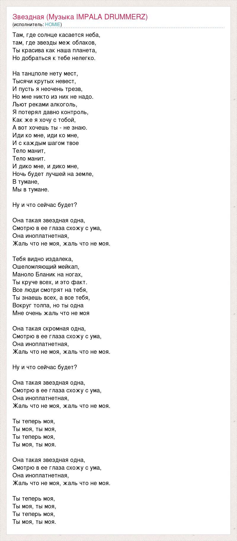 Там, где солнце касается неба, там, где звезды меж облаков, Ты красива как наша планета, Но добраться к тебе нелегко. На танцполе нету мест, Тысячи крутых невест, И пусть я неочень трезв, Но мне никто из них не надо. Льют реками алкоголь, Я потерял давно контроль, Как же я хочу с тобой, А вот хочешь ты - не знаю. Иди ко мне, иди ко мне, И с каждым шагом твое Тело манит, Тело манит. И дико мне, и дико мне, Ночь будет лучшей на земле, В тумане, Мы в тумане. Ну и что сейчас будет? Она такая звездная одна, Смотрю в ее глаза схожу с ума, Она иноплатнетная, Жаль что не моя, жаль что не моя. Тебя видно издалека, Ошеломляющий мейкап, Маноло Бланик на ногах, Ты круче всех, и это факт. Все люди смотрят на тебя, Ты знаешь всех, а все тебя, Вокруг толпа, но ты одна Мне очень жаль что не моя Она такая скромная одна, Смотрю в ее глаза схожу с ума, Она иноплатнетная, Жаль что не моя, жаль что не моя. Ну и что сейчас будет? Она такая звездная одна, Смотрю в ее глаза схожу с ума, Она иноплатнетная, Жаль что не моя, жаль что не моя. Ты теперь моя, Ты моя, ты моя, Ты теперь моя, Ты моя, ты моя. Она такая звездная одна, Смотрю в ее глаза схожу с ума, Она иноплатнетная, Жаль что не моя, жаль что не моя. Ты теперь моя, Ты моя, ты моя, Ты теперь моя, Ты моя, ты моя.