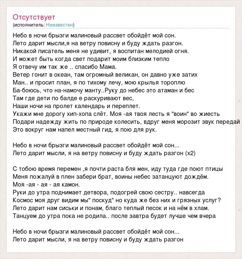 Небо в ночи брызги малиновый рассвет обойдёт мой сон. Лето дарит мысли,я на ветру повисну и буду ждать разгон. Никакой писатель меня не удивит, я воспитан мелодией огня. И может быть когда свет подарит моим близким тепло Я отвечу им так же .. спасибо Мама. Ветер гонит в океан, там огромный великан, он давно уже затих Ман.. и просит план, я по тихому лечу, мою крылья тороплю Ба-боюсь, что на-намочу манту..Руку до небес это атаман и бес Там где дети по балде е раскуривают вес, Наши ночи на пролет календарь и переплет. Укажи мне дорогу хип-хопа слёт. Моя -ая твоя лесть я "воин" во жиесть Подари надежду жить по природе колесить, вдруг меня морозит звук передай Это вокруг нам напел местный гид, я пою для рук. Небо в ночи брызги малиновый рассвет обойдёт мой сон... Лето дарит мысли, я на ветру повисну и буду ждать разгон (х2) С тобою время перемен ,я почти раста бля мен, иду туда где поют птицы Меня пожалуй в плен забери брат, воины небес затанцуют дождём. Моя -ая - ая - ая камон. Руки до утра поднимает детвора, подогрей свою сестру.. навсегда Космос моя друг видим мы" поскуд" но куда же без них и грязных услуг? Лето дарит нам сиськи и понам, благо теплый песок и на нём в хлам. Танцуем до утра пока не родила.. после завтра будет лучше чем вчера Небо в ночи брызги малиновый рассвет обойдёт мой сон... Лето дарит мысли, я на ветру повисну и буду ждать разгон