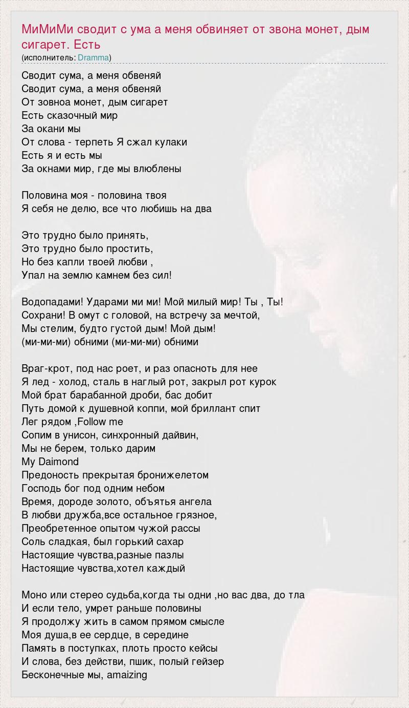 Сводит сума, а меня обвеняй Сводит сума, а меня обвеняй От зовноа монет, дым сигарет Есть сказочный мир За окани мы От слова - терпеть Я сжал кулаки Есть я и есть мы За окнами мир, где мы влюблены Половина моя - половина твоя Я себя не делю, все что любишь на два Это трудно было принять, Это трудно было простить, Но без капли твоей любви , Упал на землю камнем без сил! Водопадами! Ударами ми ми! Мой милый мир! Ты , Ты! Сохрани! В омут с головой, на встречу за мечтой, Мы стелим, будто густой дым! Мой дым! (ми-ми-ми) обними (ми-ми-ми) обними Враг-крот, под нас роет, и раз опасноть для нее Я лед - холод, сталь в наглый рот, закрыл рот курок Мой брат барабанной дроби, бас добит Путь домой к душевной коппи, мой бриллант спит Лег рядом ,Follow me Сопим в унисон, синхронный дайвин, Мы не берем, только дарим My Daimond Предоность прекрытая бронижелетом Господь бог под одним небом Время, дороде золото, объятья ангела В любви дружба,все остальное грязное, Преобретенное опытом чужой рассы Соль сладкая, был горький сахар Настоящие чувства,разные пазлы Настоящие чувства,хотел каждый Моно или стерео судьба,когда ты одни ,но вас два, до тла И если тело, умрет раньше половины Я продолжу жить в самом прямом смысле Моя душа,в ее сердце, в середине Память в поступках, плоть просто кейсы И слова, без действи, пшик, полый гейзер Бесконечные мы, amaizing