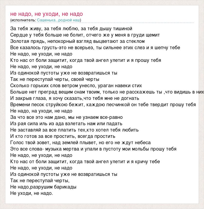 За тебя живу, за тебя люблю, за тебя дышу тишиной Сердце у тебя больше не болит, отчего же у меня в груди щемит Золотая прядь, непокорный взгляд выцветают за стеклом Все казалось грусть-это не всерьез, ты сильнее этих слез и я шепчу тебе Не надо, не уходи, не надо Кто нас от боли защитит, когда твой ангел улетит и я прошу тебя Не надо, не уходи, не надо Из одинокой пустоты уже не возвратишься ты Так не переступай черты, своей черты Сколько горьких слов ветром унесло, ураган навеки стих Больше нет преград вещим снам твоим, только не расскажешь ты ,что видишь в них И закрыв глаза, я хочу сказать,что тебя мне не догнать Времени песок струйкою бежит, каждою песчинкой он тебе твердит прошу тебя Не надо, на уходи, не надо За что все это нам дано, мы не узнаем все-равно Из рая сила иль из ада взлетать нам или падать Не заставляй за все платить тех,кто хотел тебя любить И кто готов за все простить, всегда простить Голос твой зовет, над землей плывет, но его не ждут небеса Это все слова- музыка мертва и упали в пустоту мои мольбы прошу тебя Не надо, не уходи, не надо Кто нас от боли защитит, когда твой ангел улетит и я кричу тебе Не надо, не уходи, не надо Из одинокой пустоты уже не возвратишься ты Так не переступай черты, Не надо,разрушим барикады Не уходи, не надо.