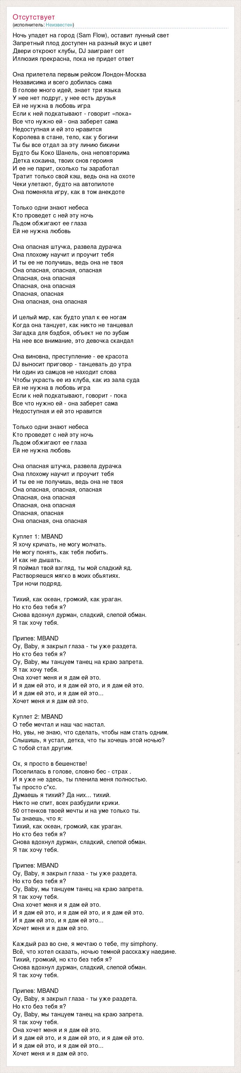 Ночь упадет на город (Sam Flow), оставит лунный свет Запретный плод доступен на разный вкус и цвет Двери откроют клубы, DJ заиграет сет Иллюзия прекрасна, пока не придет ответ Она прилетела первым рейсом Лондон-Москва Независима и всего добилась сама В голове много идей, знает три языка У нее нет подруг, у нее есть друзья Ей не нужна в любовь игра Если к ней подкатывают - говорит «пока» Все что нужно ей - она заберет сама Недоступная и ей это нравится Королева в стане, тело, как у богини Ты бы все отдал за эту линию бикини Будто бы Коко Шанель, она неповторима Детка кокаина, твоих снов героиня И ее не парит, сколько ты заработал Тратит только свой кэш, ведь она на охоте Чеки улетают, будто на автопилоте Она поменяла игру, как в том анекдоте Только одни знают небеса Кто проведет с ней эту ночь Льдом обжигают ее глаза Ей не нужна любовь Она опасная штучка, развела дурачка Она плохому научит и проучит тебя И ты ее не получишь, ведь она не твоя Она опасная, опасная, опасная Опасная, она опасная Опасная, она опасная Опасная, опасная Она опасная, она опасная И целый мир, как будто упал к ее ногам Когда она танцует, как никто не танцевал Загадка для бэдбоя, объект не по зубам На нее все внимание, это девочка скандал Она виновна, преступление - ее красота DJ выносит приговор - танцевать до утра Ни один из самцов не находит слова Чтобы украсть ее из клуба, как из зала суда Ей не нужна в любовь игра Если к ней подкатывают, говорит - пока Все что нужно ей - она заберет сама Недоступная и ей это нравится Только одни знают небеса Кто проведет с ней эту ночь Льдом обжигают ее глаза Ей не нужна любовь Она опасная штучка, развела дурачка Она плохому научит и проучит тебя И ты ее не получишь, ведь она не твоя Она опасная, опасная, опасная Опасная, она опасная Опасная, она опасная Опасная, опасная Она опасная, она опасная Куплет 1: MBAND Я хочу кричать, не могу молчать. Не могу понять, как тебя любить. И как не дышать. Я поймал твой взгляд, ты мой сладкий яд. Растворяешся мягко в моих обьятиях. Три ночи подряд. Тихий, как океан, громкий, как ураган. Но кто без тебя я? Снова вдохнул дурман, сладкий, слепой обман. Я так хочу тебя. Припев: MBAND Оу, Baby, я закрыл глаза - ты уже рaздета. Но кто без тебя я? Оу, Baby, мы танцуем танец на краю запрета. Я так хочу тебя. Она хочет меня и я дам ей это. И я дам ей это, и я дам ей это, и я дам ей это. И я дам ей это, и я дам ей это... Хочет меня и я дам ей это. Куплет 2: MBAND О тебе мечтал и наш час настал. Но, увы, не знаю, что сделать, чтобы нам стать одним. Слышишь, я устал, детка, что ты хочешь этой ночью? С тобой стал другим. Ох, я просто в бешенстве! Поселилась в голове, словно бес - страх . И я уже не здесь, ты пленила меня полностью. Ты просто с*кс. Думаешь я тихий? Да них... тихий. Никто не спит, всех разбудили крики. 50 оттенков твоей мечты и на уме только ты. Ты знаешь, что я: Тихий, как океан, громкий, как ураган. Но кто без тебя я? Снова вдохнул дурман, сладкий, слепой обман. Я так хочу тебя. Припев: MBAND Оу, Baby, я закрыл глаза - ты уже рaздета. Но кто без тебя я? Оу, Baby, мы танцуем танец на краю запрета. Я так хочу тебя. Она хочет меня и я дам ей это. И я дам ей это, и я дам ей это, и я дам ей это. И я дам ей это, и я дам ей это... Хочет меня и я дам ей это. Каждый раз во сне, я мечтаю о тебе, my simphony. Всё, что хотел сказать, ночью темной расскажу наедине. Тихий, громкий, но кто без тебя я? Снова вдохнул дурман, сладкий, слеп