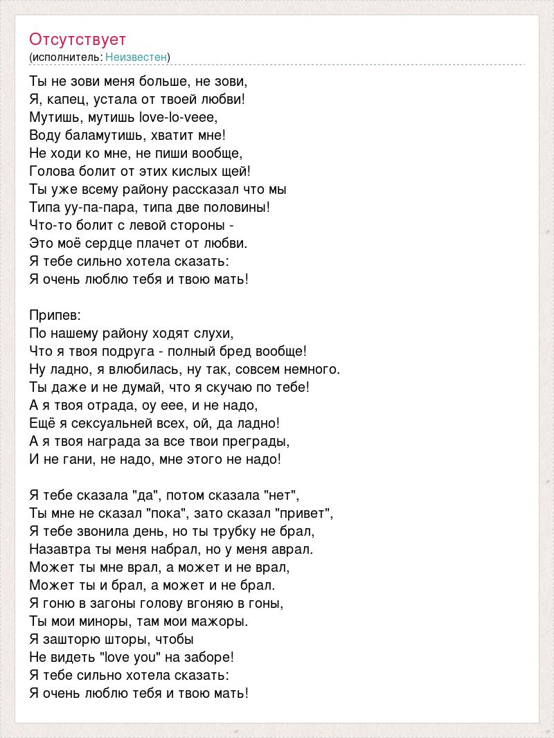 Ты не зови меня больше, не зови, Я, капец, устала от твоей любви! Мутишь, мутишь love-lo-veee, Воду баламутишь, хватит мне! Не ходи ко мне, не пиши вообще, Голова болит от этих кислых щей! Ты уже всему району рассказал что мы Типа уу-па-пара, типа две половины! Что-то болит с левой стороны - Это моё сердце плачет от любви. Я тебе сильно хотела сказать: Я очень люблю тебя и твою мать! Припев: По нашему району ходят слухи, Что я твоя подруга - полный бред вообще! Ну ладно, я влюбилась, ну так, совсем немного. Ты даже и не думай, что я скучаю по тебе! А я твоя отрада, оу еее, и не надо, Ещё я сексуальней всех, ой, да ладно! А я твоя награда за все твои преграды, И не гани, не надо, мне этого не надо! Я тебе сказала "да", потом сказала "нет", Ты мне не сказал "пока", зато сказал "привет", Я тебе звонила день, но ты трубку не брал, Назавтра ты меня набрал, но у меня аврал. Может ты мне врал, а может и не врал, Может ты и брал, а может и не брал. Я гоню в загоны голову вгоняю в гоны, Ты мои миноры, там мои мажоры. Я зашторю шторы, чтобы Не видеть "love you" на заборе! Я тебе сильно хотела сказать: Я очень люблю тебя и твою мать!