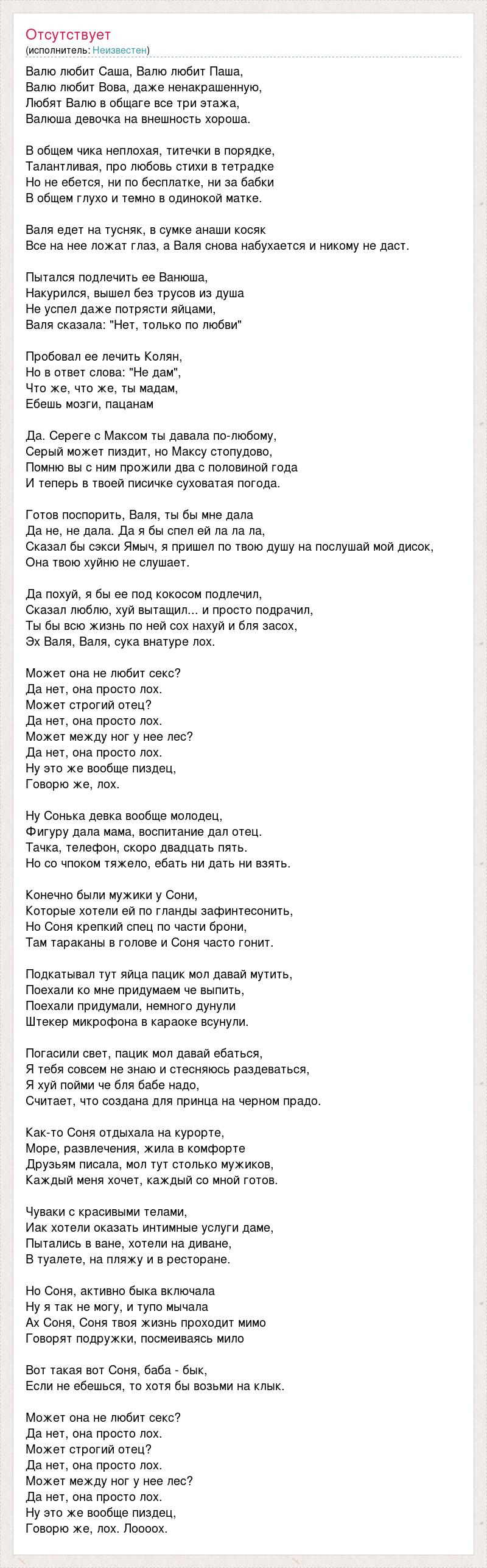 Валю любит Саша, Валю любит Паша, Валю любит Вова, даже ненакрашенную, Любят Валю в общаге все три этажа, Валюша девочка на внешность хороша. В общем чика неплохая, титечки в порядке, Талантливая, про любовь стихи в тетрадке Но не ебется, ни по бесплатке, ни за бабки В общем глухо и темно в одинокой матке. Валя едет на тусняк, в сумке анаши косяк Все на нее ложат глаз, а Валя снова набухается и никому не даст. Пытался подлечить ее Ванюша, Накурился, вышел без трусов из душа Не успел даже потрясти яйцами, Валя сказала: "Нет, только по любви" Пробовал ее лечить Колян, Но в ответ слова: "Не дам", Что же, что же, ты мадам, Ебешь мозги, пацанам Да. Сереге с Максом ты давала по-любому, Серый может пиздит, но Максу стопудово, Помню вы с ним прожили два с половиной года И теперь в твоей писичке суховатая погода. Готов поспорить, Валя, ты бы мне дала Да не, не дала. Да я бы спел ей ла ла ла, Сказал бы сэкси Ямыч, я пришел по твою душу на послушай мой дисок, Она твою хуйню не слушает. Да похуй, я бы ее под кокосом подлечил, Сказал люблю, хуй вытащил... и просто подрачил, Ты бы всю жизнь по ней сох нахуй и бля засох, Эх Валя, Валя, сука внатуре лох. Может она не любит секс? Да нет, она просто лох. Может строгий отец? Да нет, она просто лох. Может между ног у нее лес? Да нет, она просто лох. Ну это же вообще пиздец, Говорю же, лох. Ну Сонька девка вообще молодец, Фигуру дала мама, воспитание дал отец. Тачка, телефон, скоро двадцать пять. Но со чпоком тяжело, ебать ни дать ни взять. Конечно были мужики у Сони, Которые хотели ей по гланды зафинтесонить, Но Соня крепкий спец по части брони, Там тараканы в голове и Соня часто гонит. Подкатывал тут яйца пацик мол давай мутить, Поехали ко мне придумаем че выпить, Поехали придумали, немного дунули Штекер микрофона в караоке всунули. Погасили свет, пацик мол давай ебаться, Я тебя совсем не знаю и стесняюсь раздеваться, Я хуй пойми че бля бабе надо, Считает, что создана для принца на черном прадо. Как-то Соня отдыхала на курорте, Море, развлечения, жила в комфорте Друзьям писала, мол тут столько мужиков, Каждый меня хочет, каждый со мной готов. Чуваки с красивыми телами, Иак хотели оказать интимные услуги даме, Пытались в ване, хотели на диване, В туалете, на пляжу и в ресторане. Но Соня, активно быка включала Ну я так не могу, и тупо мычала Ах Соня, Соня твоя жизнь проходит мимо Говорят подружки, посмеиваясь мило Вот такая вот Соня, баба - бык, Если не ебешься, то хотя бы возьми на клык. Может она не любит секс? Да нет, она просто лох. Может строгий отец? Да нет, она просто лох. Может между ног у нее лес? Да нет, она просто лох. Ну это же вообще пиздец, Говорю же, лох. Лоооох.