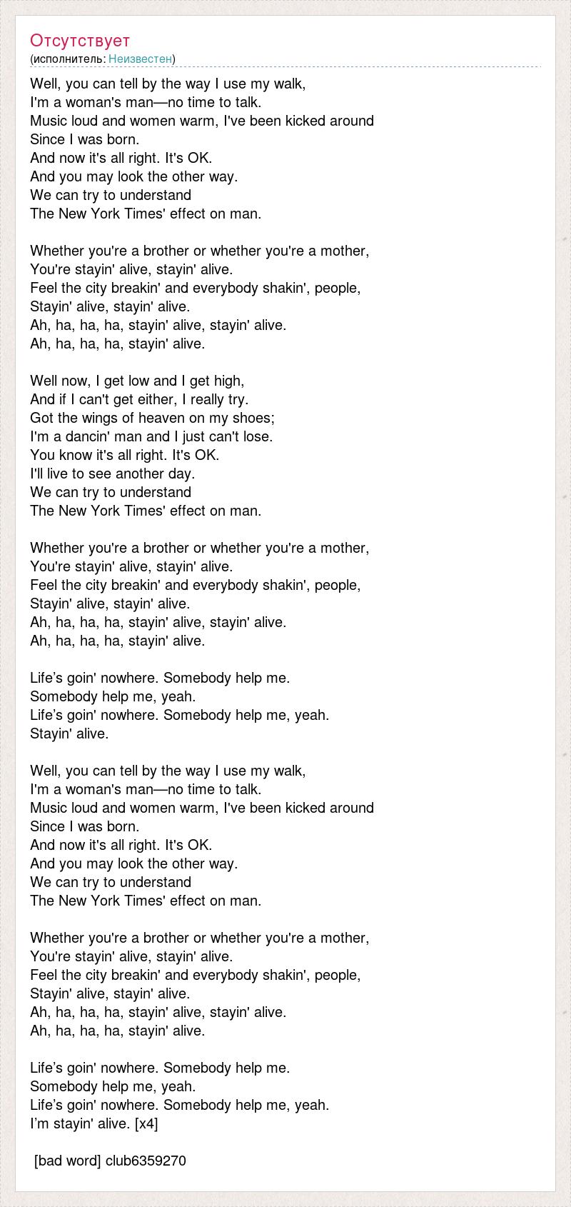 Well, you can tell by the way I use my walk, I'm a woman's man—no time to talk. Music loud and women warm, I've been kicked around Since I was born. And now it's all right. It's OK. And you may look the other way. We can try to understand The New York Times' effect on man. Whether you're a brother or whether you're a mother, You're stayin' alive, stayin' alive. Feel the city breakin' and everybody shakin', people, Stayin' alive, stayin' alive. Ah, ha, ha, ha, stayin' alive, stayin' alive. Ah, ha, ha, ha, stayin' alive. Well now, I get low and I get high, And if I can't get either, I really try. Got the wings of heaven on my shoes; I'm a dancin' man and I just can't lose. You know it's all right. It's OK. I'll live to see another day. We can try to understand The New York Times' effect on man. Whether you're a brother or whether you're a mother, You're stayin' alive, stayin' alive. Feel the city breakin' and everybody shakin', people, Stayin' alive, stayin' alive. Ah, ha, ha, ha, stayin' alive, stayin' alive. Ah, ha, ha, ha, stayin' alive. Life’s goin' nowhere. Somebody help me. Somebody help me, yeah. Life’s goin' nowhere. Somebody help me, yeah. Stayin' alive. Well, you can tell by the way I use my walk, I'm a woman's man—no time to talk. Music loud and women warm, I've been kicked around Since I was born. And now it's all right. It's OK. And you may look the other way. We can try to understand The New York Times' effect on man. Whether you're a brother or whether you're a mother, You're stayin' alive, stayin' alive. Feel the city breakin' and everybody shakin', people, Stayin' alive, stayin' alive. Ah, ha, ha, ha, stayin' alive, stayin' alive. Ah, ha, ha, ha, stayin' alive. Life’s goin' nowhere. Somebody help me. Somebody help me, yeah. Life’s goin' nowhere. Somebody help me, yeah. I’m stayin' alive. [x4] [bad word] club6359270