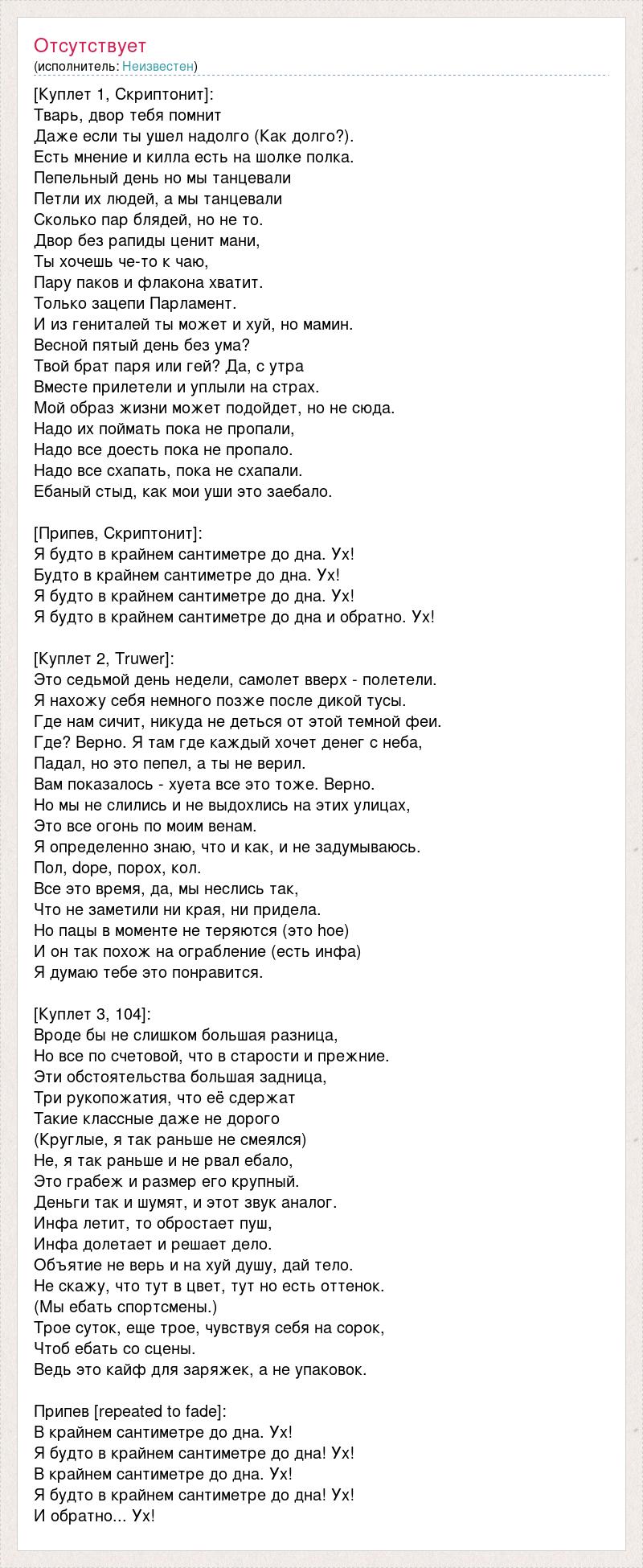 [Куплет 1, Скриптонит]: Тварь, двор тебя помнит Даже если ты ушел надолго (Как долго?). Есть мнение и килла есть на шолке полка. Пепельный день но мы танцевали Петли их людей, а мы танцевали Сколько пар блядей, но не то. Двор без рапиды ценит мани, Ты хочешь че-то к чаю, Пару паков и флакона хватит. Только зацепи Парламент. И из гениталей ты может и хуй, но мамин. Весной пятый день без ума? Твой брат паря или гей? Да, с утра Вместе прилетели и уплыли на страх. Мой образ жизни может подойдет, но не сюда. Надо их поймать пока не пропали, Надо все доесть пока не пропало. Надо все схапать, пока не схапали. Ебаный стыд, как мои уши это заебало. [Припев, Скриптонит]: Я будто в крайнем сантиметре до дна. Ух! Будто в крайнем сантиметре до дна. Ух! Я будто в крайнем сантиметре до дна. Ух! Я будто в крайнем сантиметре до дна и обратно. Ух! [Куплет 2, Truwer]: Это седьмой день недели, самолет вверх - полетели. Я нахожу себя немного позже после дикой тусы. Где нам сичит, никуда не деться от этой темной феи. Где? Верно. Я там где каждый хочет денег с неба, Падал, но это пепел, а ты не верил. Вам показалось - хуета все это тоже. Верно. Но мы не слились и не выдохлись на этих улицах, Это все огонь по моим венам. Я определенно знаю, что и как, и не задумываюсь. Пол, dope, порох, кол. Все это время, да, мы неслись так, Что не заметили ни края, ни придела. Но пацы в моменте не теряются (это hoe) И он так похож на ограбление (есть инфа) Я думаю тебе это понравится. [Куплет 3, 104]: Вроде бы не слишком большая разница, Но все по счетовой, что в старости и прежние. Эти обстоятельства большая задница, Три рукопожатия, что её сдержат Такие классные даже не дорого (Круглые, я так раньше не смеялся) Не, я так раньше и не рвал ебало, Это грабеж и размер его крупный. Деньги так и шумят, и этот звук аналог. Инфа летит, то обростает пуш, Инфа долетает и решает дело. Объятие не верь и на хуй душу, дай тело. Не скажу, что тут в цвет, тут но есть оттенок. (Мы ебать спортсмены.) Трое суток, еще трое, чувствуя себя на сорок, Чтоб ебать со сцены. Ведь это кайф для заряжек, а не упаковок. Припев [repeated to fade]: В крайнем сантиметре до дна. Ух! Я будто в крайнем сантиметре до дна! Ух! В крайнем сантиметре до дна. Ух! Я будто в крайнем сантиметре до дна! Ух! И обратно... Ух!