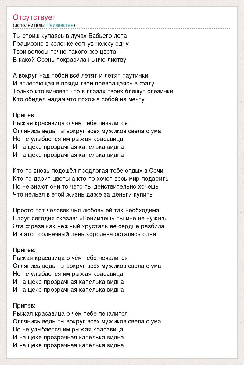 Ты стоиш купаясь в лучах Бабьего лета Грациозно в коленке согнув ножку одну Твои волосы точно такого-же цвета В какой Осень покрасила нынче листву А вокруг над тобой всё летят и летят паутинки И вплетающая в пряди твои превращаясь в фату Только кто виноват что в глазах твоих блещут слезинки Кто обидел мадам что похожа собой на мечту Припев: Рыжая красавица о чём тебе печалится Оглянись ведь ты вокруг всех мужиков свела с ума Но не улыбается им рыжая красавица И на щеке прозрачная капелька видна И на щеке прозрачная капелька видна Кто-то вновь подошёл предлогая тебе отдых в Сочи Кто-то дарит цветы а кто-то хочет весь мир подарить Но не знают они то чего ты действительно хочешь Что нельзя в этой жизнь даже за деньги купить Просто тот человек чья любовь ей так необходима Вдруг сегодня сказав: «Понимаешь ты мне не нужна» Эта фраза как нежный хрусталь её сердце разбила И в этот солнечный день королева осталась одна Припев: Рыжая красавица о чём тебе печалится Оглянись ведь ты вокруг всех мужиков свела с ума Но не улыбается им рыжая красавица И на щеке прозрачная капелька видна И на щеке прозрачная капелька видна Припев: Рыжая красавица о чём тебе печалится Оглянись ведь ты вокруг всех мужиков свела с ума Но не улыбается им рыжая красавица И на щеке прозрачная капелька видна И на щеке прозрачная капелька видна