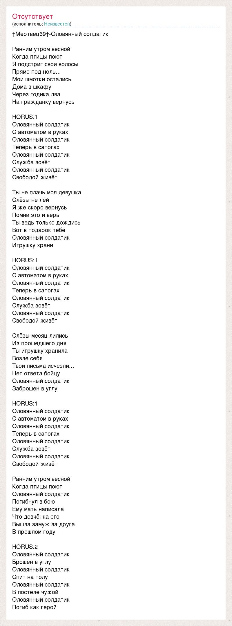 †Мертвец69†-Оловянный солдатик Ранним утром весной Когда птицы поют Я подстриг свои волосы Прямо под ноль... Мои шмотки остались Дома в шкафу Через годика два На гражданку вернусь HORUS:1 Оловянный солдатик С автоматом в руках Оловянный солдатик Теперь в сапогах Оловянный солдатик Служба зовёт Оловянный солдатик Свободой живёт Ты не плачь моя девушка Слёзы не лей Я же скоро вернусь Помни это и верь Ты ведь только дождись Вот в подарок тебе Оловянный солдатик Игрушку храни HORUS:1 Оловянный солдатик С автоматом в руках Оловянный солдатик Теперь в сапогах Оловянный солдатик Служба зовёт Оловянный солдатик Свободой живёт Слёзы месяц лились Из прошедшего дня Ты игрушку хранила Возле себя Твои письма исчезли... Нет ответа бойцу Оловянный солдатик Заброшен в углу HORUS:1 Оловянный солдатик С автоматом в руках Оловянный солдатик Теперь в сапогах Оловянный солдатик Служба зовёт Оловянный солдатик Свободой живёт Ранним утром весной Когда птицы поют Оловянный солдатик Погибнул в бою Ему мать написала Что девчёнка его Вышла замуж за друга В прошлом году HORUS:2 Оловянный солдатик Брошен в углу Оловянный солдатик Спит на полу Оловянный солдатик В постеле чужой Оловянный солдатик Погиб как герой