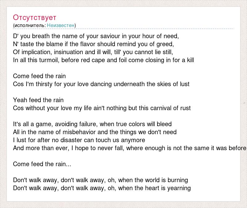 D' you breath the name of your saviour in your hour of need, N' taste the blame if the flavor should remind you of greed, Of implication, insinuation and ill will, till' you cannot lie still, In all this turmoil, before red cape and foil come closing in for a kill Come feed the rain Cos I'm thirsty for your love dancing underneath the skies of lust Yeah feed the rain Cos without your love my life ain't nothing but this carnival of rust It's all a game, avoiding failure, when true colors will bleed All in the name of misbehavior and the things we don't need I lust for after no disaster can touch us anymore And more than ever, I hope to never fall, where enough is not the same it was before Come feed the rain... Don't walk away, don't walk away, oh, when the world is burning Don't walk away, don't walk away, oh, when the heart is yearning