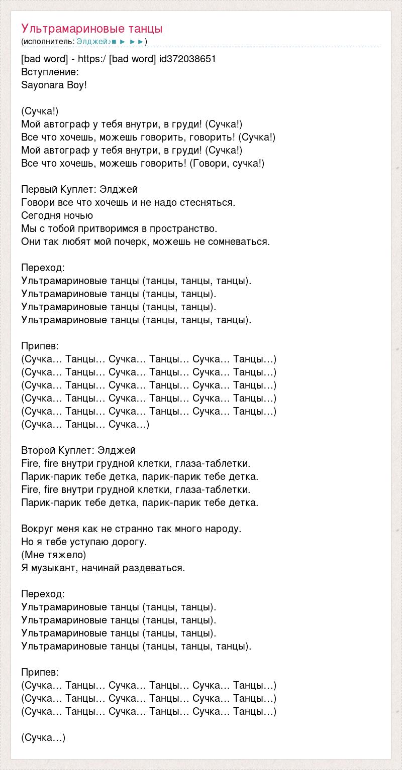 [bad word] - https:/ [bad word] id372038651 Вступление: Sayonara Boy! (Сучка!) Мой автограф у тебя внутри, в груди! (Сучка!) Все что хочешь, можешь говорить, говорить! (Сучка!) Мой автограф у тебя внутри, в груди! (Сучка!) Все что хочешь, можешь говорить! (Говори, сучка!) Первый Куплет: Элджей Говори все что хочешь и не надо стесняться. Сегодня ночью Мы с тобой притворимся в пространство. Они так любят мой почерк, можешь не сомневаться. Переход: Ультрамариновые танцы (танцы, танцы, танцы). Ультрамариновые танцы (танцы, танцы). Ультрамариновые танцы (танцы, танцы). Ультрамариновые танцы (танцы, танцы, танцы). Припев: (Сучка… Танцы… Сучка… Танцы… Сучка… Танцы…) (Сучка… Танцы… Сучка… Танцы… Сучка… Танцы…) (Сучка… Танцы… Сучка… Танцы… Сучка… Танцы…) (Сучка… Танцы… Сучка… Танцы… Сучка… Танцы…) (Сучка… Танцы… Сучка… Танцы… Сучка… Танцы…) (Сучка… Танцы… Сучка…) Второй Куплет: Элджей Fire, fire внутри грудной клетки, глаза-таблетки. Парик-парик тебе детка, парик-парик тебе детка. Fire, fire внутри грудной клетки, глаза-таблетки. Парик-парик тебе детка, парик-парик тебе детка. Вокруг меня как не странно так много народу. Но я тебе уступаю дорогу. (Мне тяжело) Я музыкант, начинай раздеваться. Переход: Ультрамариновые танцы (танцы, танцы). Ультрамариновые танцы (танцы, танцы). Ультрамариновые танцы (танцы, танцы). Ультрамариновые танцы (танцы, танцы, танцы). Припев: (Сучка… Танцы… Сучка… Танцы… Сучка… Танцы…) (Сучка… Танцы… Сучка… Танцы… Сучка… Танцы…) (Сучка… Танцы… Сучка… Танцы… Сучка… Танцы…) (Сучка…)