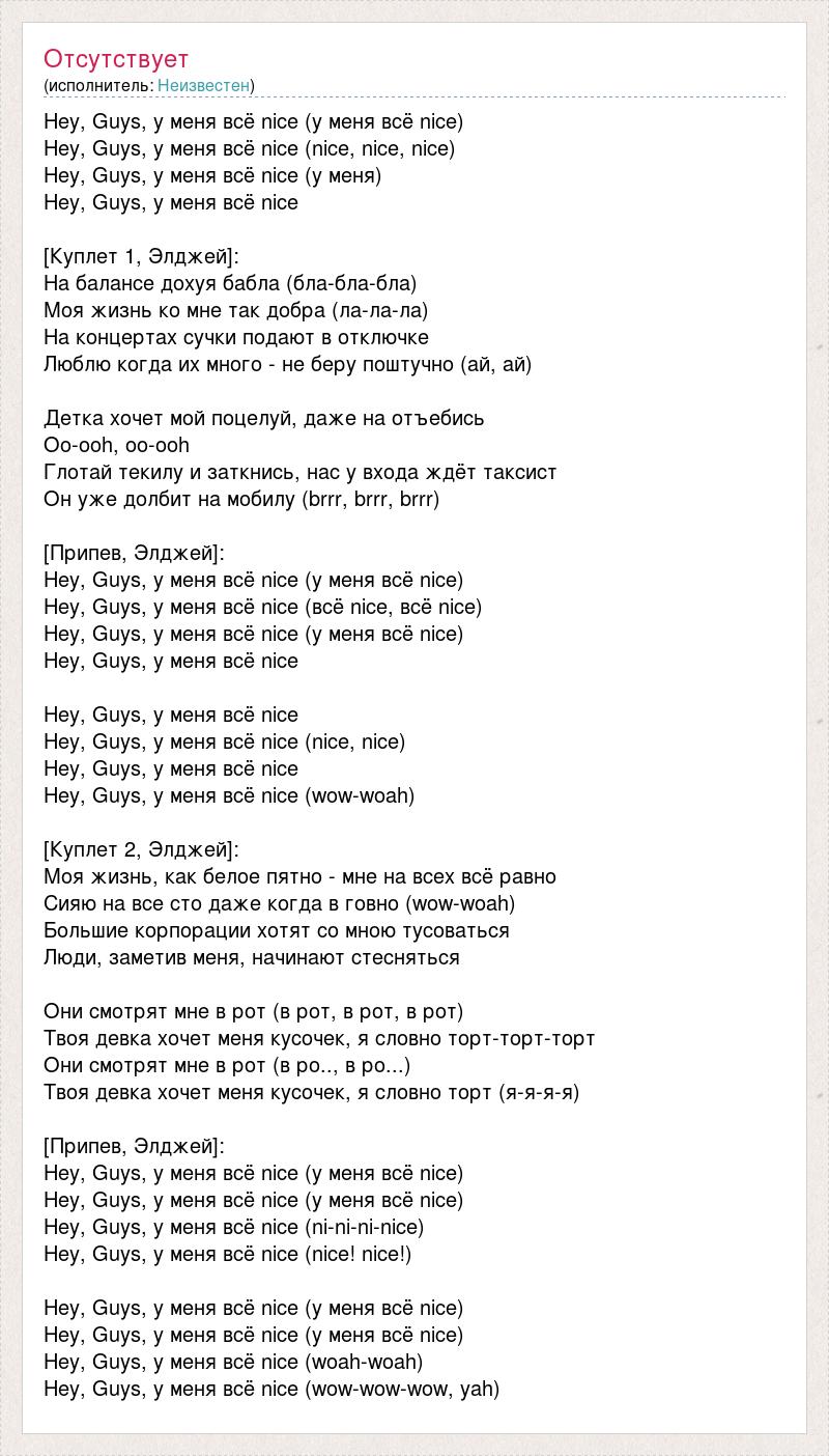 Hey, Guys, у меня всё nice (у меня всё nice) Hey, Guys, у меня всё nice (nice, nice, nice) Hey, Guys, у меня всё nice (у меня) Hey, Guys, у меня всё nice [Куплет 1, Элджей]: На балансе дохуя бабла (бла-бла-бла) Моя жизнь ко мне так добра (ла-ла-ла) На концертах сучки подают в отключке Люблю когда их много - не беру поштучно (ай, ай) Детка хочет мой поцелуй, даже на отъебись Oo-ooh, oo-ooh Глотай текилу и заткнись, нас у входа ждёт таксист Он уже долбит на мобилу (brrr, brrr, brrr) [Припев, Элджей]: Hey, Guys, у меня всё nice (у меня всё nice) Hey, Guys, у меня всё nice (всё nice, всё nice) Hey, Guys, у меня всё nice (у меня всё nice) Hey, Guys, у меня всё nice Hey, Guys, у меня всё nice Hey, Guys, у меня всё nice (nice, nice) Hey, Guys, у меня всё nice Hey, Guys, у меня всё nice (wow-woah) [Куплет 2, Элджей]: Моя жизнь, как белое пятно - мне на всех всё равно Сияю на все сто даже когда в говно (wow-woah) Большие корпорации хотят со мною тусоваться Люди, заметив меня, начинают стесняться Они смотрят мне в рот (в рот, в рот, в рот) Твоя девка хочет меня кусочек, я словно торт-торт-торт Они смотрят мне в рот (в ро.., в ро...) Твоя девка хочет меня кусочек, я словно торт (я-я-я-я) [Припев, Элджей]: Hey, Guys, у меня всё nice (у меня всё nice) Hey, Guys, у меня всё nice (у меня всё nice) Hey, Guys, у меня всё nice (ni-ni-ni-nice) Hey, Guys, у меня всё nice (nice! nice!) Hey, Guys, у меня всё nice (у меня всё nice) Hey, Guys, у меня всё nice (у меня всё nice) Hey, Guys, у меня всё nice (woah-woah) Hey, Guys, у меня всё nice (wow-wow-wow, yah)