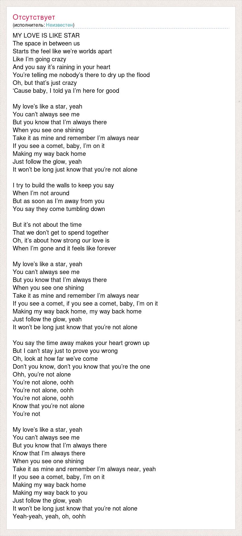 MY LOVE IS LIKE STAR The space in between us Starts the feel like we’re worlds apart Like I’m going crazy And you say it’s raining in your heart You’re telling me nobody’s there to dry up the flood Oh, but that’s just crazy ‘Cause baby, I told ya I’m here for good My love’s like a star, yeah You can’t always see me But you know that I’m always there When you see one shining Take it as mine and remember I’m always near If you see a comet, baby, I’m on it Making my way back home Just follow the glow, yeah It won’t be long just know that you’re not alone I try to build the walls to keep you say When I’m not around But as soon as I’m away from you You say they come tumbling down But it’s not about the time That we don’t get to spend together Oh, it’s about how strong our love is When I’m gone and it feels like forever My love’s like a star, yeah You can’t always see me But you know that I’m always there When you see one shining Take it as mine and remember I’m always near If you see a comet, if you see a comet, baby, I’m on it Making my way back home, my way back home Just follow the glow, yeah It won’t be long just know that you’re not alone You say the time away makes your heart grown up But I can’t stay just to prove you wrong Oh, look at how far we’ve come Don’t you know, don’t you know that you’re the one Ohh, you’re not alone You’re not alone, oohh You’re not alone, oohh You’re not alone, oohh Know that you’re not alone You’re not My love’s like a star, yeah You can’t always see me But you know that I’m always there Know that I’m always there When you see one shining Take it as mine and remember I’m always near, yeah If you see a comet, baby, I’m on it Making my way back home Making my way back to you Just follow the glow, yeah It won’t be long just know that you’re not alone Yeah-yeah, yeah, oh, oohh