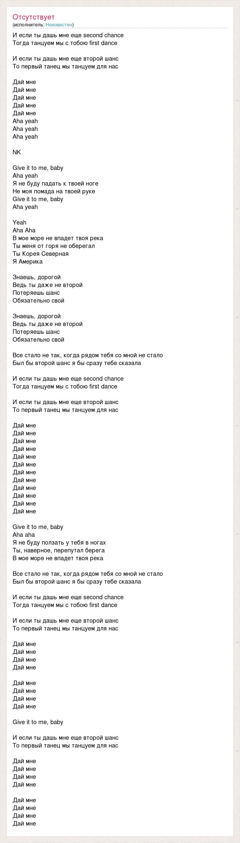 И если ты дашь мне еще second chance Тогда танцуем мы с тобою first dance И если ты дашь мне еще второй шанс То первый танец мы танцуем для нас Дай мне Дай мне Дай мне Дай мне Дай мне Аha yeah Аha yeah Аhа yeah NK Give it to me, baby Aha yeah Я не буду падать к твоей ноге Не моя помада на твоей руке Give it to me, baby Aha yeah Yeah Aha Aha В мое море не впадет твоя река Ты меня от горя не оберегал Ты Корея Северная Я Америка Знаешь, дорогой Ведь ты даже не второй Потеряешь шанс Обязательно свой Знаешь, дорогой Ведь ты даже не второй Потеряешь шанс Обязательно свой Все стало не так, когда рядом тебя со мной не стало Был бы второй шанс я бы сразу тебе сказала И если ты дашь мне еще second chance Тогда танцуем мы с тобою first dance И если ты дашь мне еще второй шанс То первый танец мы танцуем для нас Дай мне Дай мне Дай мне Дай мне Дай мне Дай мне Дай мне Дай мне Дай мне Дай мне Дай мне Дай мне Give it to me, baby Аha аhа Я не буду ползать у тебя в ногах Ты, наверное, перепутал берега В мое море не впадет твоя река Все стало не так, когда рядом тебя со мной не стало Был бы второй шанс я бы сразу тебе сказала И если ты дашь мне еще second chance Тогда танцуем мы с тобою first dance И если ты дашь мне еще второй шанс То первый танец мы танцуем для нас Дай мне Дай мне Дай мне Дай мне Дай мне Дай мне Дай мне Дай мне Give it to me, baby И если ты дашь мне еще второй шанс То первый танец мы танцуем для нас Дай мне Дай мне Дай мне Дай мне Дай мне Дай мне Дай мне Дай мне