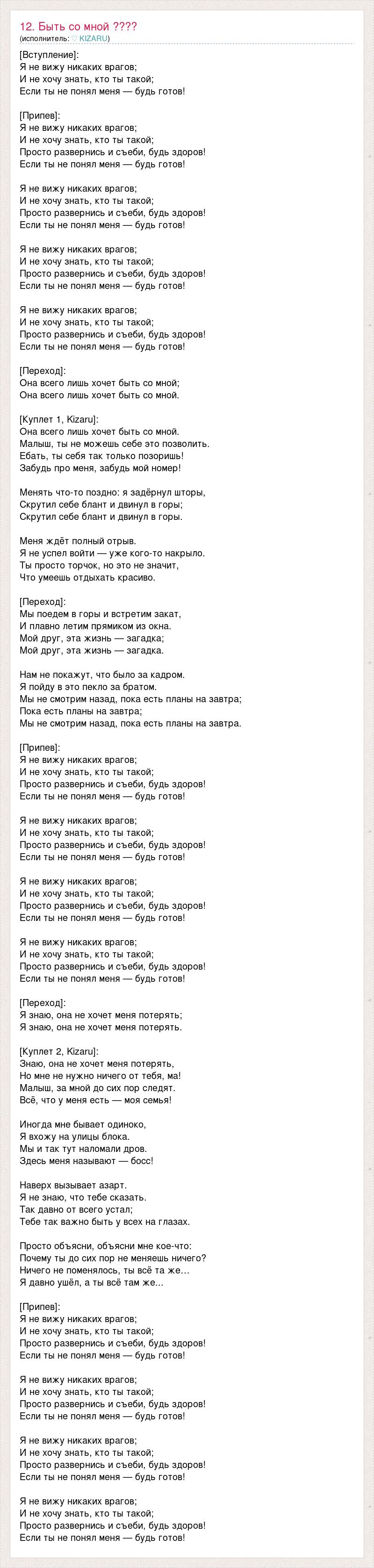 [Вступление]: Я не вижу никаких врагов; И не хочу знать, кто ты такой; Если ты не понял меня — будь готов! [Припев]: Я не вижу никаких врагов; И не хочу знать, кто ты такой; Просто развернись и съеби, будь здоров! Если ты не понял меня — будь готов! Я не вижу никаких врагов; И не хочу знать, кто ты такой; Просто развернись и съеби, будь здоров! Если ты не понял меня — будь готов! Я не вижу никаких врагов; И не хочу знать, кто ты такой; Просто развернись и съеби, будь здоров! Если ты не понял меня — будь готов! Я не вижу никаких врагов; И не хочу знать, кто ты такой; Просто развернись и съеби, будь здоров! Если ты не понял меня — будь готов! [Переход]: Она всего лишь хочет быть со мной; Она всего лишь хочет быть со мной. [Куплет 1, Kizaru]: Она всего лишь хочет быть со мной. Малыш, ты не можешь себе это позволить. Ебать, ты себя так только позоришь! Забудь про меня, забудь мой номер! Менять что-то поздно: я задёрнул шторы, Скрутил себе блант и двинул в горы; Скрутил себе блант и двинул в горы. Меня ждёт полный отрыв. Я не успел войти — уже кого-то накрыло. Ты просто торчок, но это не значит, Что умеешь отдыхать красиво. [Переход]: Мы поедем в горы и встретим закат, И плавно летим прямиком из окна. Мой друг, эта жизнь — загадка; Мой друг, эта жизнь — загадка. Нам не покажут, что было за кадром. Я пойду в это пекло за братом. Мы не смотрим назад, пока есть планы на завтра; Пока есть планы на завтра; Мы не смотрим назад, пока есть планы на завтра. [Припев]: Я не вижу никаких врагов; И не хочу знать, кто ты такой; Просто развернись и съеби, будь здоров! Если ты не понял меня — будь готов! Я не вижу никаких врагов; И не хочу знать, кто ты такой; Просто развернись и съеби, будь здоров! Если ты не понял меня — будь готов! Я не вижу никаких врагов; И не хочу знать, кто ты такой; Просто развернись и съеби, будь здоров! Если ты не понял меня — будь готов! Я не вижу никаких врагов; И не хочу знать, кто ты такой; Просто развернись и съеби, будь здоров! Если ты не понял меня — будь готов! [Переход]: Я знаю, она не хочет меня потерять; Я знаю, она не хочет меня потерять. [Куплет 2, Kizaru]: Знаю, она не хочет меня потерять, Но мне не нужно ничего от тебя, ма! Малыш, за мной до сих пор следят. Всё, что у меня есть — моя семья! Иногда мне бывает одиноко, Я вхожу на улицы блока. Мы и так тут наломали дров. Здесь меня называют — босс! Наверх вызывает азарт. Я не знаю, что тебе сказать. Так давно от всего устал; Тебе так важно быть у всех на глазах. Просто объясни, объясни мне кое-что: Почему ты до сих пор не меняешь ничего? Ничего не поменялось, ты всё та же… Я давно ушёл, а ты всё там же... [Припев]: Я не вижу никаких врагов; И не хочу знать, кто ты такой; Просто развернись и съеби, будь здоров! Если ты не понял меня — будь готов! Я не вижу никаких врагов; И не хочу знать, кто ты такой; Просто развернись и съеби, будь здоров! Если ты не понял меня — будь готов! Я не вижу никаких врагов; И не хочу знать, кто ты такой; Просто развернись и съеби, будь здоров! Если ты не понял меня — будь готов! Я не вижу никаких врагов; И не хочу знать, кто ты такой; Просто развернись и съеби, будь здоров! Если ты не понял меня — будь готов!