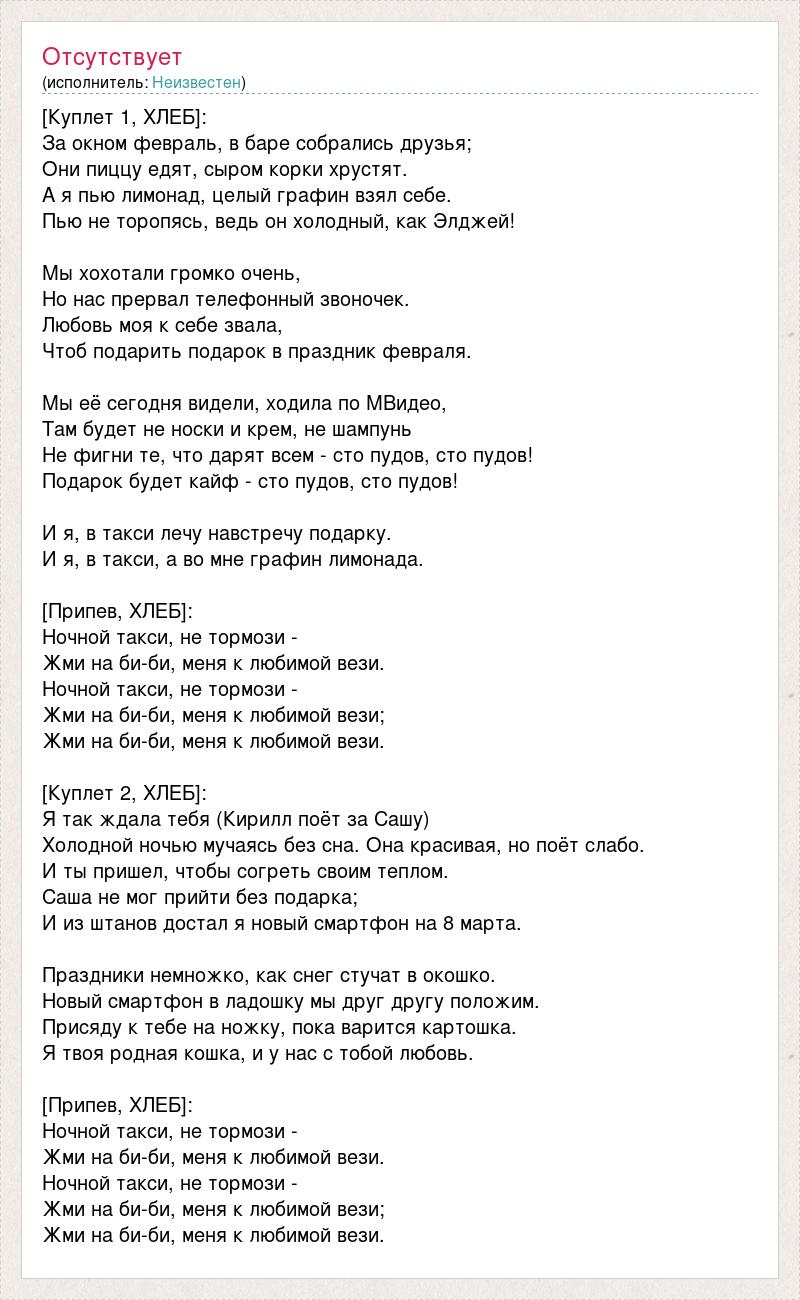[Куплет 1, ХЛЕБ]: За окном февраль, в баре собрались друзья; Они пиццу едят, сыром корки хрустят. А я пью лимонад, целый графин взял себе. Пью не торопясь, ведь он холодный, как Элджей! Мы хохотали громко очень, Но нас прервал телефонный звоночек. Любовь моя к себе звала, Чтоб подарить подарок в праздник февраля. Мы её сегодня видели, ходила по МВидео, Там будет не носки и крем, не шампунь Не фигни те, что дарят всем - сто пудов, сто пудов! Подарок будет кайф - сто пудов, сто пудов! И я, в такси лечу навстречу подарку. И я, в такси, а во мне графин лимонада. [Припев, ХЛЕБ]: Ночной такси, не тормози - Жми на би-би, меня к любимой вези. Ночной такси, не тормози - Жми на би-би, меня к любимой вези; Жми на би-би, меня к любимой вези. [Куплет 2, ХЛЕБ]: Я так ждала тебя (Кирилл поёт за Сашу) Холодной ночью мучаясь без сна. Она красивая, но поёт слабо. И ты пришел, чтобы согреть своим теплом. Саша не мог прийти без подарка; И из штанов достал я новый смартфон на 8 марта. Праздники немножко, как снег стучат в окошко. Новый смартфон в ладошку мы друг другу положим. Присяду к тебе на ножку, пока варится картошка. Я твоя родная кошка, и у нас с тобой любовь. [Припев, ХЛЕБ]: Ночной такси, не тормози - Жми на би-би, меня к любимой вези. Ночной такси, не тормози - Жми на би-би, меня к любимой вези; Жми на би-би, меня к любимой вези.