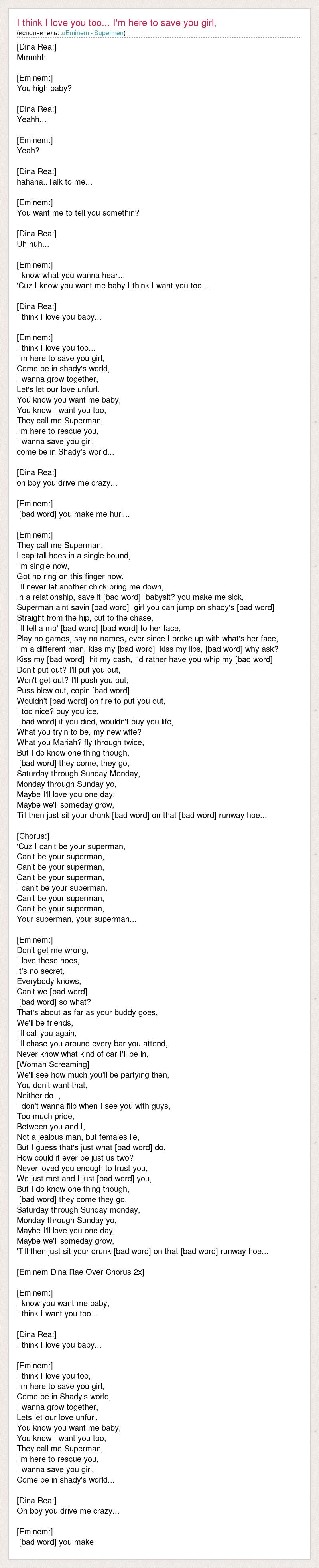 [Dina Rea:] Mmmhh [Eminem:] You high baby? [Dina Rea:] Yeahh... [Eminem:] Yeah? [Dina Rea:] hahaha..Talk to me... [Eminem:] You want me to tell you somethin? [Dina Rea:] Uh huh... [Eminem:] I know what you wanna hear... 'Cuz I know you want me baby I think I want you too... [Dina Rea:] I think I love you baby... [Eminem:] I think I love you too... I'm here to save you girl, Come be in shady's world, I wanna grow together, Let's let our love unfurl. You know you want me baby, You know I want you too, They call me Superman, I'm here to rescue you, I wanna save you girl, come be in Shady's world... [Dina Rea:] oh boy you drive me crazy... [Eminem:] [bad word] you make me hurl... [Eminem:] They call me Superman, Leap tall hoes in a single bound, I'm single now, Got no ring on this finger now, I'll never let another chick bring me down, In a relationship, save it [bad word] babysit? you make me sick, Superman aint savin [bad word] girl you can jump on shady's [bad word] Straight from the hip, cut to the chase, I'll tell a mo' [bad word] [bad word] to her face, Play no games, say no names, ever since I broke up with what's her face, I'm a different man, kiss my [bad word] kiss my lips, [bad word] why ask? Kiss my [bad word] hit my cash, I'd rather have you whip my [bad word] Don't put out? I'll put you out, Won't get out? I'll push you out, Puss blew out, copin [bad word] Wouldn't [bad word] on fire to put you out, I too nice? buy you ice, [bad word] if you died, wouldn't buy you life, What you tryin to be, my new wife? What you Mariah? fly through twice, But I do know one thing though, [bad word] they come, they go, Saturday through Sunday Monday, Monday through Sunday yo, Maybe I'll love you one day, Maybe we'll someday grow, Till then just sit your drunk [bad word] on that [bad word] runway hoe... [Chorus:] 'Cuz I can't be your superman, Can't be your superman, Can't be your superman, Can't be your superman, I can't be your superman, Can't be your superman, Can't be your superman, Your superman, your superman... [Eminem:] Don't get me wrong, I love these hoes, It's no secret, Everybody knows, Can't we [bad word] [bad word] so what? That's about as far as your buddy goes, We'll be friends, I'll call you again, I'll chase you around every bar you attend, Never know what kind of car I'll be in, [Woman Screaming] We'll see how much you'll be partying then, You don't want that, Neither do I, I don't wanna flip when I see you with guys, Too much pride, Between you and I, Not a jealous man, but females lie, But I guess that's just what [bad word] do, How could it ever be just us two? Never loved you enough to trust you, We just met and I just [bad word] you, But I do know one thing though, [bad word] they come they go, Saturday through Sunday monday, Monday through Sunday yo, Maybe I'll love you one day, Maybe we'll someday grow, 'Till then just sit your drunk [bad word] on that [bad word] runway hoe... [Eminem Dina Rae Over Chorus 2x] [Eminem:] I know you want me baby, I think I want you too... [Dina Rea:] I think I love you baby... [Eminem:] I think I love you too, I'm here to save you girl, Come be in Shady's world, I wanna grow together, Lets let our love unfurl, You know you want me baby, You know I want you too, They call me Superman, I'm here to rescue you, I wanna save you girl, Come be in shady's world... [Dina Rea:] Oh boy you drive me crazy... [Eminem:] [bad word] you make