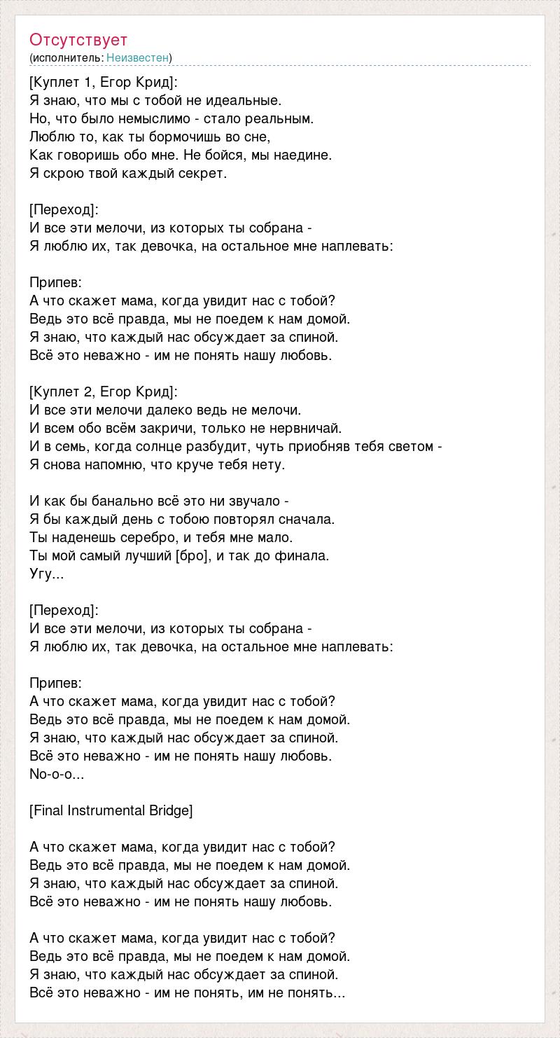 [Куплет 1, Егор Крид]: Я знаю, что мы с тобой не идеальные. Но, что было немыслимо - стало реальным. Люблю то, как ты бормочишь во сне, Как говоришь обо мне. Не бойся, мы наедине. Я скрою твой каждый секрет. [Переход]: И все эти мелочи, из которых ты собрана - Я люблю их, так девочка, на остальное мне наплевать: Припев: А что скажет мама, когда увидит нас с тобой? Ведь это всё правда, мы не поедем к нам домой. Я знаю, что каждый нас обсуждает за спиной. Всё это неважно - им не понять нашу любовь. [Куплет 2, Егор Крид]: И все эти мелочи далеко ведь не мелочи. И всем обо всём закричи, только не нервничай. И в семь, когда солнце разбудит, чуть приобняв тебя светом - Я снова напомню, что круче тебя нету. И как бы банально всё это ни звучало - Я бы каждый день с тобою повторял сначала. Ты наденешь серебро, и тебя мне мало. Ты мой самый лучший [бро], и так до финала. Угу... [Переход]: И все эти мелочи, из которых ты собрана - Я люблю их, так девочка, на остальное мне наплевать: Припев: А что скажет мама, когда увидит нас с тобой? Ведь это всё правда, мы не поедем к нам домой. Я знаю, что каждый нас обсуждает за спиной. Всё это неважно - им не понять нашу любовь. No-o-o... [Final Instrumental Bridge] А что скажет мама, когда увидит нас с тобой? Ведь это всё правда, мы не поедем к нам домой. Я знаю, что каждый нас обсуждает за спиной. Всё это неважно - им не понять нашу любовь. А что скажет мама, когда увидит нас с тобой? Ведь это всё правда, мы не поедем к нам домой. Я знаю, что каждый нас обсуждает за спиной. Всё это неважно - им не понять, им не понять...