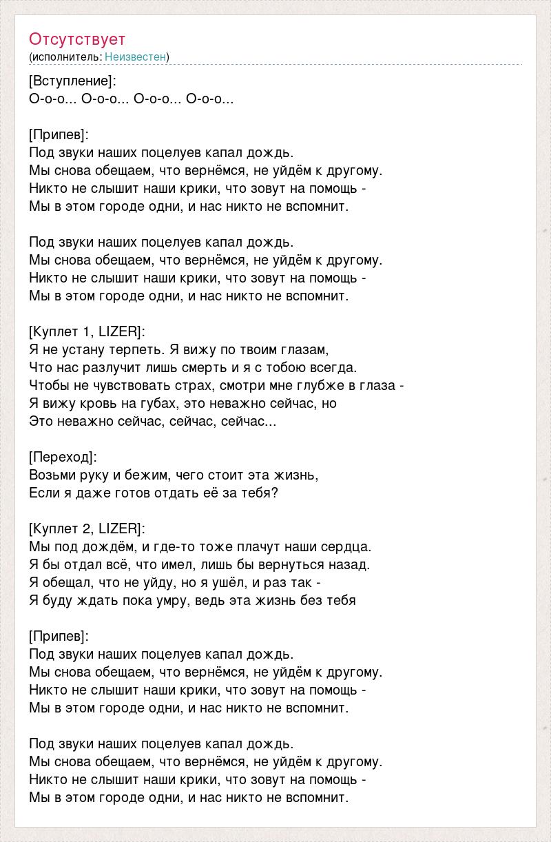 [Вступление]: О-о-о... О-о-о... О-о-о... О-о-о... [Припев]: Под звуки наших поцелуев капал дождь. Мы снова обещаем, что вернёмся, не уйдём к другому. Никто не слышит наши крики, что зовут на помощь - Мы в этом городе одни, и нас никто не вспомнит. Под звуки наших поцелуев капал дождь. Мы снова обещаем, что вернёмся, не уйдём к другому. Никто не слышит наши крики, что зовут на помощь - Мы в этом городе одни, и нас никто не вспомнит. [Куплет 1, LIZER]: Я не устану терпеть. Я вижу по твоим глазам, Что нас разлучит лишь смерть и я с тобою всегда. Чтобы не чувствовать страх, смотри мне глубже в глаза - Я вижу кровь на губах, это неважно сейчас, но Это неважно сейчас, сейчас, сейчас... [Переход]: Возьми руку и бежим, чего стоит эта жизнь, Если я даже готов отдать её за тебя? [Куплет 2, LIZER]: Мы под дождём, и где-то тоже плачут наши сердца. Я бы отдал всё, что имел, лишь бы вернуться назад. Я обещал, что не уйду, но я ушёл, и раз так - Я буду ждать пока умру, ведь эта жизнь без тебя [Припев]: Под звуки наших поцелуев капал дождь. Мы снова обещаем, что вернёмся, не уйдём к другому. Никто не слышит наши крики, что зовут на помощь - Мы в этом городе одни, и нас никто не вспомнит. Под звуки наших поцелуев капал дождь. Мы снова обещаем, что вернёмся, не уйдём к другому. Никто не слышит наши крики, что зовут на помощь - Мы в этом городе одни, и нас никто не вспомнит.