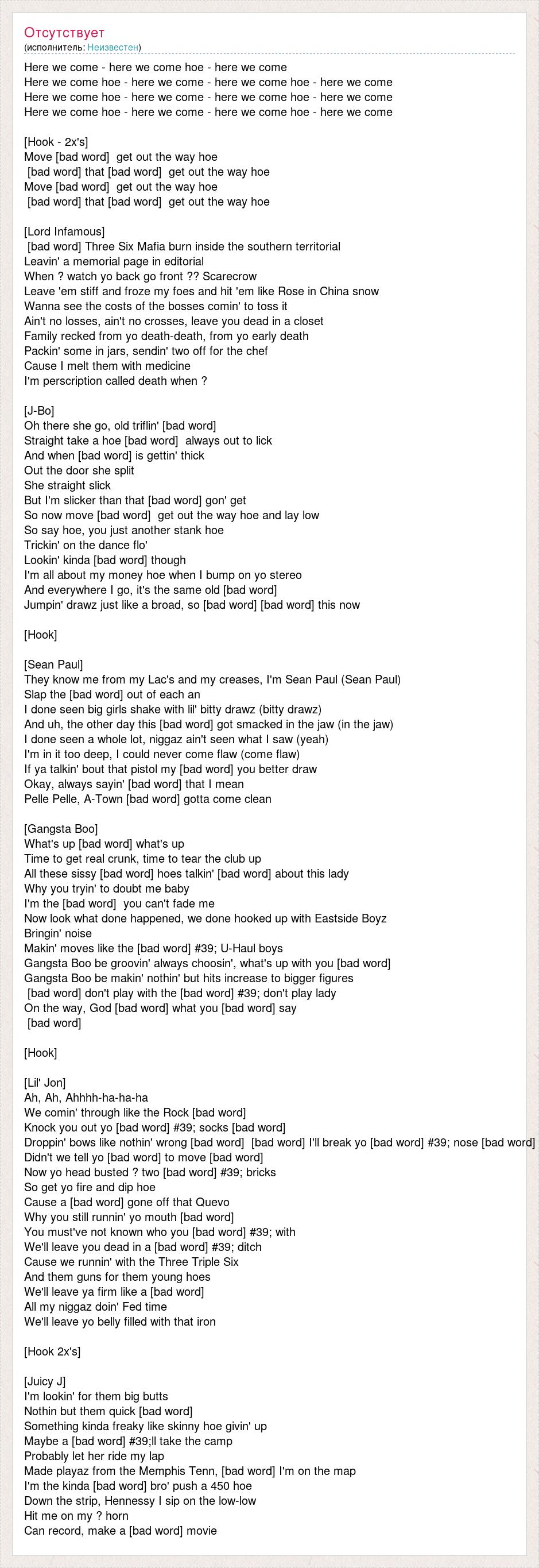 Here we come - here we come hoe - here we come Here we come hoe - here we come - here we come hoe - here we come Here we come hoe - here we come - here we come hoe - here we come Here we come hoe - here we come - here we come hoe - here we come [Hook - 2x's] Move [bad word] get out the way hoe [bad word] that [bad word] get out the way hoe Move [bad word] get out the way hoe [bad word] that [bad word] get out the way hoe [Lord Infamous] [bad word] Three Six Mafia burn inside the southern territorial Leavin' a memorial page in editorial When ? watch yo back go front ?? Scarecrow Leave 'em stiff and froze my foes and hit 'em like Rose in China snow Wanna see the costs of the bosses comin' to toss it Ain't no losses, ain't no crosses, leave you dead in a closet Family recked from yo death-death, from yo early death Packin' some in jars, sendin' two off for the chef Cause I melt them with medicine I'm perscription called death when ? [J-Bo] Oh there she go, old triflin' [bad word] Straight take a hoe [bad word] always out to lick And when [bad word] is gettin' thick Out the door she split She straight slick But I'm slicker than that [bad word] gon' get So now move [bad word] get out the way hoe and lay low So say hoe, you just another stank hoe Trickin' on the dance flo' Lookin' kinda [bad word] though I'm all about my money hoe when I bump on yo stereo And everywhere I go, it's the same old [bad word] Jumpin' drawz just like a broad, so [bad word] [bad word] this now [Hook] [Sean Paul] They know me from my Lac's and my creases, I'm Sean Paul (Sean Paul) Slap the [bad word] out of each an I done seen big girls shake with lil' bitty drawz (bitty drawz) And uh, the other day this [bad word] got smacked in the jaw (in the jaw) I done seen a whole lot, niggaz ain't seen what I saw (yeah) I'm in it too deep, I could never come flaw (come flaw) If ya talkin' bout that pistol my [bad word] you better draw Okay, always sayin' [bad word] that I mean Pelle Pelle, A-Town [bad word] gotta come clean [Gangsta Boo] What's up [bad word] what's up Time to get real crunk, time to tear the club up All these sissy [bad word] hoes talkin' [bad word] about this lady Why you tryin' to doubt me baby I'm the [bad word] you can't fade me Now look what done happened, we done hooked up with Eastside Boyz Bringin' noise Makin' moves like the [bad word] #39; U-Haul boys Gangsta Boo be groovin' always choosin', what's up with you [bad word] Gangsta Boo be makin' nothin' but hits increase to bigger figures [bad word] don't play with the [bad word] #39; don't play lady On the way, God [bad word] what you [bad word] say [bad word] [Hook] [Lil' Jon] Ah, Ah, Ahhhh-ha-ha-ha We comin' through like the Rock [bad word] Knock you out yo [bad word] #39; socks [bad word] Droppin' bows like nothin' wrong [bad word] [bad word] I'll break yo [bad word] #39; nose [bad word] Didn't we tell yo [bad word] to move [bad word] Now yo head busted ? two [bad word] #39; bricks So get yo fire and dip hoe Cause a [bad word] gone off that Quevo Why you still runnin' yo mouth [bad word] You must've not known who you [bad word] #39; with We'll leave you dead in a [bad word] #39; ditch Cause we runnin' with the Three Triple Six And them guns for them young hoes We'll leave ya firm like a [bad word] All my niggaz doin' Fed time We'll leave yo belly filled with that iron [Hook 2x's] [Juicy J] I'm lookin' for them big butts Nothin but them quick [bad word] Something kinda freaky like skinny hoe givin' up Maybe a [bad word] #39;ll take the camp Probably let her ride my lap Made playaz from the Memphis Tenn, [bad word] I'm on the map I'm the kinda [bad word] bro' push a 450 hoe Down the strip, Hennessy I sip on the low-low Hit me on my ? horn Can record, make a [bad word] movie