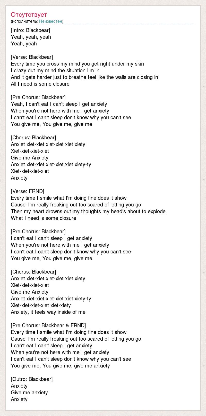 [Intro: Blackbear] Yeah, yeah, yeah Yeah, yeah [Verse: Blackbear] Every time you cross my mind you get right under my skin I crazy out my mind the situation I'm in And it gets harder just to breathe feel like the walls are closing in All I need is some closure [Pre Chorus: Blackbear] Yeah, I can't eat I can't sleep I get anxiety When you're not here with me I get anxiety I can't eat I can't sleep don't know why you can't see You give me, You give me, give me [Chorus: Blackbear] Anxiet xiet-xiet xiet-xiet xiet xiety Xiet-xiet-xiet-xiet Give me Anxiety Anxiet xiet-xiet xiet-xiet xiet xiety-ty Xiet-xiet-xiet-xiet Anxiety [Verse: FRND] Every time I smile what I'm doing fine does it show Cause' I'm really freaking out too scared of letting you go Then my heart drowns out my thoughts my head's about to explode What I need is some closure [Pre Chorus: Blackbear] I can't eat I can't sleep I get anxiety When you're not here with me I get anxiety I can't eat I can't sleep don't know why you can't see You give me, You give me, give me [Chorus: Blackbear] Anxiet xiet-xiet xiet-xiet xiet xiety Xiet-xiet-xiet-xiet Give me Anxiety Anxiet xiet-xiet xiet-xiet xiet xiety-ty Xiet-xiet-xiet-xiet xiet-xiety Anxiety, it feels way inside of me [Pre Chorus: Blackbear & FRND] Every time I smile what I'm doing fine does it show Cause' I'm really freaking out too scared of letting you go I can't eat I can't sleep I get anxiety When you're not here with me I get anxiety I can't eat I can't sleep don't know why you can't see You give me, You give me, give me anxiety [Outro: Blackbear] Anxiety Give me anxiety Anxiety