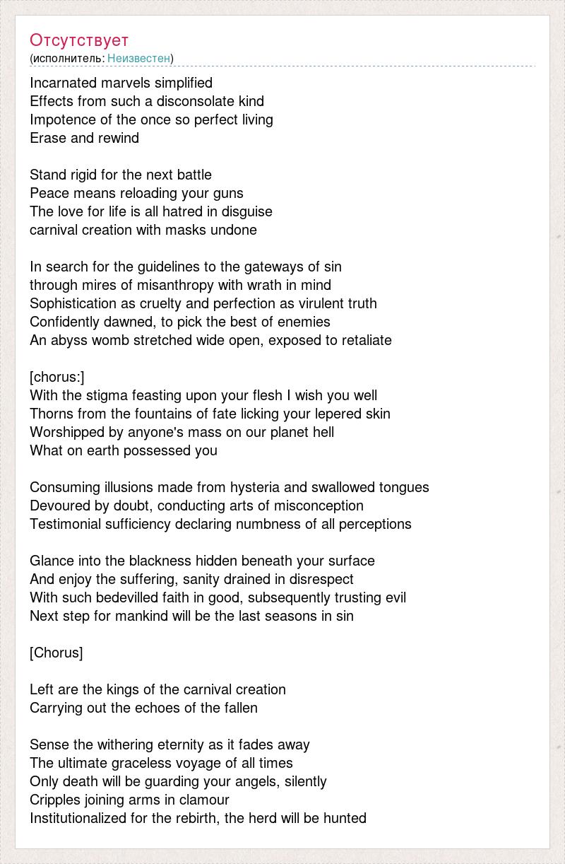 Incarnated marvels simplified Effects from such a disconsolate kind Impotence of the once so perfect living Erase and rewind Stand rigid for the next battle Peace means reloading your guns The love for life is all hatred in disguise carnival creation with masks undone In search for the guidelines to the gateways of sin through mires of misanthropy with wrath in mind Sophistication as cruelty and perfection as virulent truth Confidently dawned, to pick the best of enemies An abyss womb stretched wide open, exposed to retaliate [chorus:] With the stigma feasting upon your flesh I wish you well Thorns from the fountains of fate licking your lepered skin Worshipped by anyone's mass on our planet hell What on earth possessed you Consuming illusions made from hysteria and swallowed tongues Devoured by doubt, conducting arts of misconception Testimonial sufficiency declaring numbness of all perceptions Glance into the blackness hidden beneath your surface And enjoy the suffering, sanity drained in disrespect With such bedevilled faith in good, subsequently trusting evil Next step for mankind will be the last seasons in sin [Chorus] Left are the kings of the carnival creation Carrying out the echoes of the fallen Sense the withering eternity as it fades away The ultimate graceless voyage of all times Only death will be guarding your angels, silently Cripples joining arms in clamour Institutionalized for the rebirth, the herd will be hunted