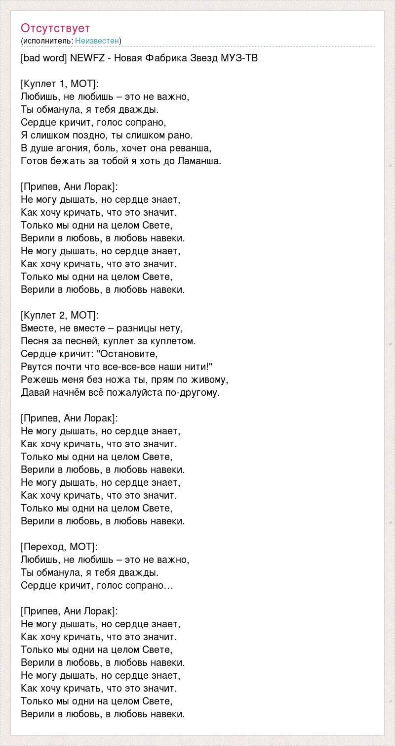 [bad word] NEWFZ - Новая Фабрика Звезд МУЗ-ТВ [Куплет 1, МОТ]: Любишь, не любишь – это не важно, Ты обманула, я тебя дважды. Сердце кричит, голос сопрано, Я слишком поздно, ты слишком рано. В душе агония, боль, хочет она реванша, Готов бежать за тобой я хоть до Ламанша. [Припев, Ани Лорак]: Не могу дышать, но сердце знает, Как хочу кричать, что это значит. Только мы одни на целом Свете, Верили в любовь, в любовь навеки. Не могу дышать, но сердце знает, Как хочу кричать, что это значит. Только мы одни на целом Свете, Верили в любовь, в любовь навеки. [Куплет 2, МОТ]: Вместе, не вместе – разницы нету, Песня за песней, куплет за куплетом. Сердце кричит: "Остановите, Рвутся почти что все-все-все наши нити!" Режешь меня без ножа ты, прям по живому, Давай начнём всё пожалуйста по-другому. [Припев, Ани Лорак]: Не могу дышать, но сердце знает, Как хочу кричать, что это значит. Только мы одни на целом Свете, Верили в любовь, в любовь навеки. Не могу дышать, но сердце знает, Как хочу кричать, что это значит. Только мы одни на целом Свете, Верили в любовь, в любовь навеки. [Переход, МОТ]: Любишь, не любишь – это не важно, Ты обманула, я тебя дважды. Сердце кричит, голос сопрано… [Припев, Ани Лорак]: Не могу дышать, но сердце знает, Как хочу кричать, что это значит. Только мы одни на целом Свете, Верили в любовь, в любовь навеки. Не могу дышать, но сердце знает, Как хочу кричать, что это значит. Только мы одни на целом Свете, Верили в любовь, в любовь навеки.
