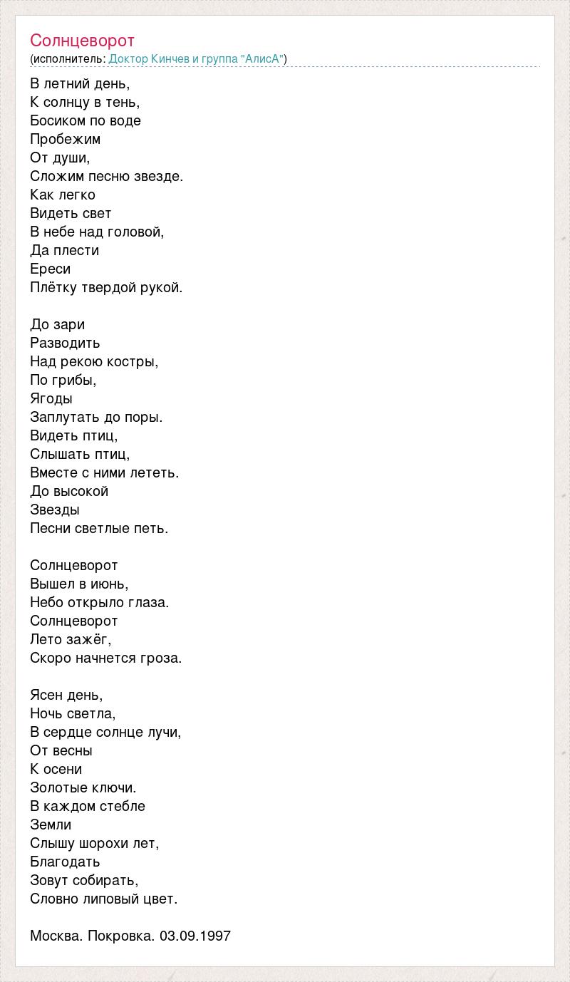 В летний день, К солнцу в тень, Босиком по воде Пробежим От души, Сложим песню звезде. Как легко Видеть свет В небе над головой, Да плести Ереси Плётку твердой рукой. До зари Разводить Над рекою костры, По грибы, Ягоды Заплутать до поры. Видеть птиц, Слышать птиц, Вместе с ними лететь. До высокой Звезды Песни светлые петь. Солнцеворот Вышел в июнь, Небо открыло глаза. Солнцеворот Лето зажёг, Скоро начнется гроза. Ясен день, Ночь светла, В сердце солнце лучи, От весны К осени Золотые ключи. В каждом стебле Земли Слышу шорохи лет, Благодать Зовут собирать, Словно липовый цвет. Москва. Покровка. 03.09.1997