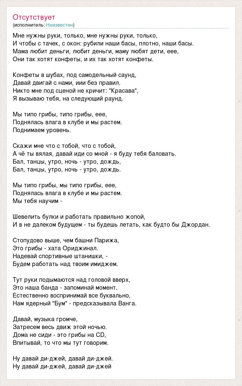 Мне нужны руки, только, мне нужны руки, только, И чтобы с тачек, с окон: рубили наши басы, плотно, наши басы. Мама любит деньги, любит деньги, маму любят дети, еее, Они так хотят конфеты, и их так хотят конфеты. Конфеты в шубах, под самодельный саунд, Давай двигай с нами, иии без правил. Никто мне под сценой не кричит: "Красава", Я вызываю тебя, на следующий раунд. Мы типо грибы, типо грибы, еее, Поднялась влага в клубе и мы растем. Поднимаем уровень. Скажи мне что с тобой, что с тобой, А чё ты вялая, давай иди со мной - я буду тебя баловать. Бал, танцы, утро, ночь - утро, дождь, Бал, танцы, утро, ночь - утро, дождь. Мы типо грибы, мы типо грибы, еее, Поднялась влага в клубе и мы растем. Мы тебя научим - Шевелить булки и работать правильно жопой, И в не далеком будущем - ты будешь летать, как будто бы Джордан. Стопудово выше, чем башни Парижа, Это грибы - хата Ориджинал. Надевай спортивные штанишки, - Будем работать над твоим имиджем. Тут руки подымаются над головой вверх, Это наша банда - запоминай момент. Естественно воспринимай все буквально, Нам ядерный "Бум" - предсказывала Ванга. Давай, музыка громче, Затресем весь движ этой ночью. Дома не сиди - это грибы на CD, Впитывай, то что мы тут говорим. Ну давай ди-джей, давай ди-джей. Ну давай ди-джей, давай ди-джей