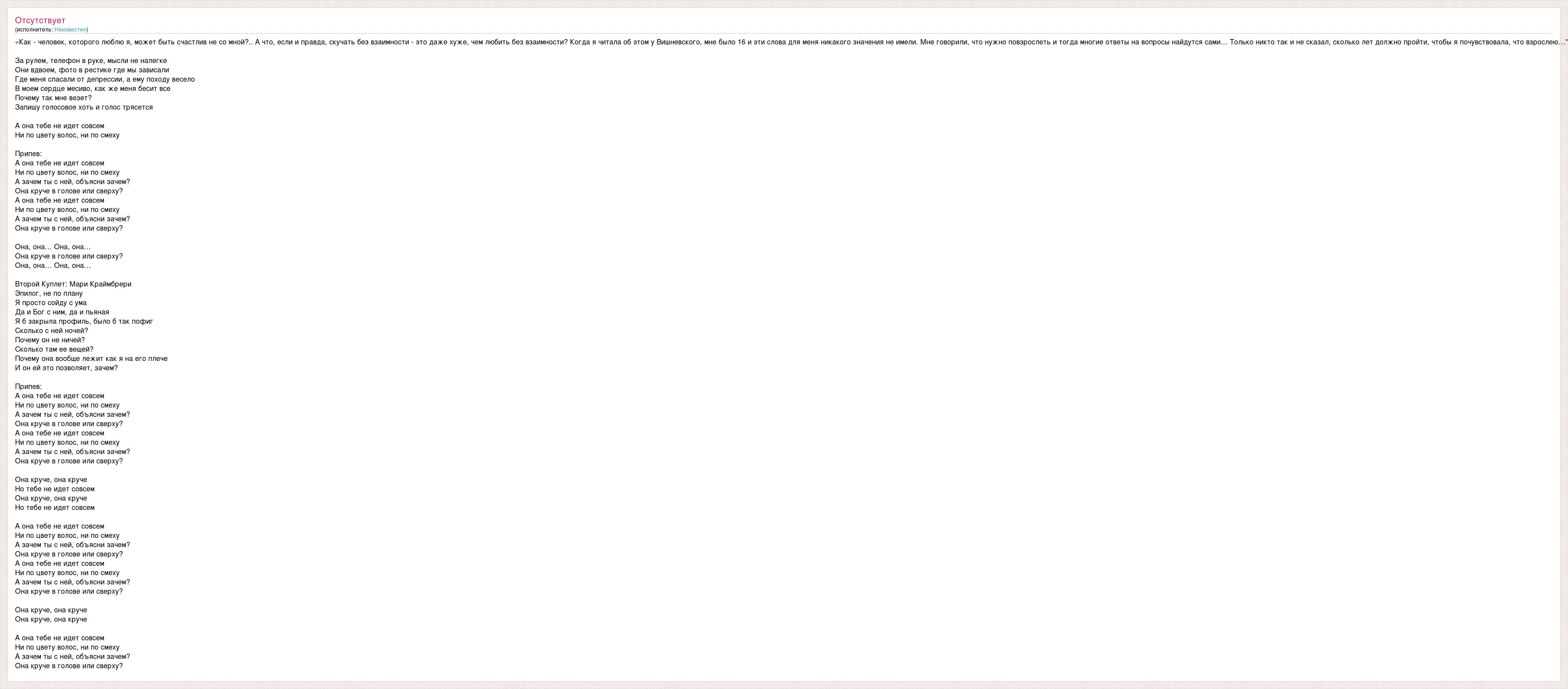«Как - человек, которого люблю я, может быть счастлив не со мной?.. А что, если и правда, скучать без взаимности - это даже хуже, чем любить без взаимности? Когда я читала об этом у Вишневского, мне было 16 и эти слова для меня никакого значения не имели. Мне говорили, что нужно повзрослеть и тогда многие ответы на вопросы найдутся сами… Только никто так и не сказал, сколько лет должно пройти, чтобы я почувствовала, что взрослею…” За рулем, телефон в руке, мысли не налегке Они вдвоем, фото в рестике где мы зависали Где меня спасали от депрессии, а ему походу весело В моем сердце месиво, как же меня бесит все Почему так мне везет? Запишу голосовое хоть и голос трясется А она тебе не идет совсем Ни по цвету волос, ни по смеху Припев: А она тебе не идет совсем Ни по цвету волос, ни по смеху А зачем ты с ней, объясни зачем? Она круче в голове или сверху? А она тебе не идет совсем Ни по цвету волос, ни по смеху А зачем ты с ней, объясни зачем? Она круче в голове или сверху? Она, она… Она, она… Она круче в голове или сверху? Она, она… Она, она… Второй Куплет: Мари Краймбрери Эпилог, не по плану Я просто сойду с ума Да и Бог с ним, да и пьяная Я б закрыла профиль, было б так пофиг Сколько с ней ночей? Почему он не ничей? Сколько там ее вещей? Почему она вообще лежит как я на его плече И он ей это позволяет, зачем? Припев: А она тебе не идет совсем Ни по цвету волос, ни по смеху А зачем ты с ней, объясни зачем? Она круче в голове или сверху? А она тебе не идет совсем Ни по цвету волос, ни по смеху А зачем ты с ней, объясни зачем? Она круче в голове или сверху? Она круче, она круче Но тебе не идет совсем Она круче, она круче Но тебе не идет совсем А она тебе не идет совсем Ни по цвету волос, ни по смеху А зачем ты с ней, объясни зачем? Она круче в голове или сверху? А она тебе не идет совсем Ни по цвету волос, ни по смеху А зачем ты с ней, объясни зачем? Она круче в голове или сверху? Она круче, она круче Она круче, она круче А она тебе не идет совсем Ни по цвету волос, ни по смеху А зачем ты с ней, объясни зачем? Она круче в голове или сверху?