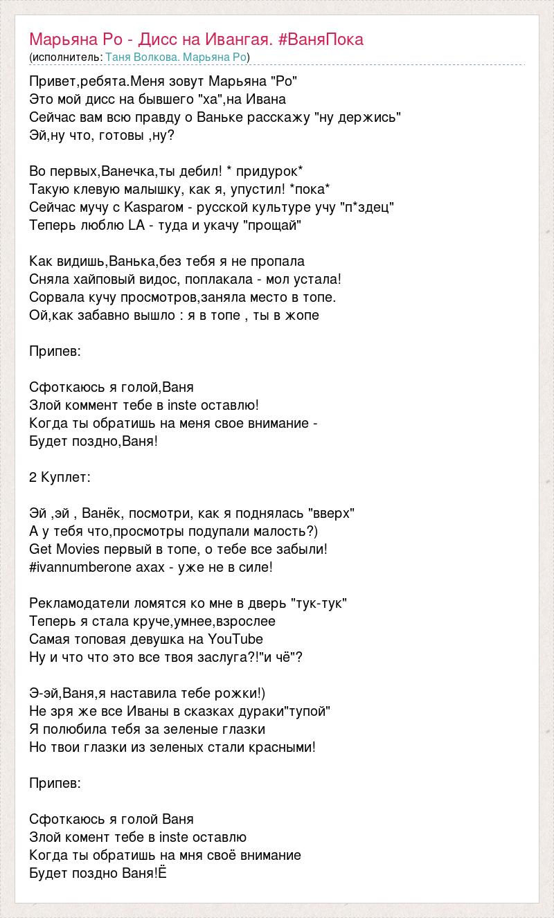 Привет,ребята.Меня зовут Марьяна "Ро" Это мой дисс на бывшего "ха",на Ивана Сейчас вам всю правду о Ваньке расскажу "ну держись" Эй,ну что, готовы ,ну? Во первых,Ванечка,ты дебил! * придурок* Такую клевую малышку, как я, упустил! *пока* Сейчас мучу с Kasparом - русской культуре учу "п*здец" Теперь люблю LA - туда и укачу "прощай" Как видишь,Ванька,без тебя я не пропала Сняла хайповый видос, поплакала - мол устала! Сорвала кучу просмотров,заняла место в топе. Ой,как забавно вышло : я в топе , ты в жопе Припев: Сфоткаюсь я голой,Ваня Злой коммент тебе в inste оставлю! Когда ты обратишь на меня свое внимание - Будет поздно,Ваня! 2 Куплет: Эй ,эй , Ванёк, посмотри, как я поднялась "вверх" А у тебя что,просмотры подупали малость?) Get Movies первый в топе, о тебе все забыли! #ivannumberone ахах - уже не в силе! Рекламодатели ломятся ко мне в дверь "тук-тук" Теперь я стала круче,умнее,взрослее Самая топовая девушка на YouTube Ну и что что это все твоя заслуга?!"и чё"? Э-эй,Ваня,я наставила тебе рожки!) Не зря же все Иваны в сказках дураки"тупой" Я полюбила тебя за зеленые глазки Но твои глазки из зеленых стали красными! Припев: Сфоткаюсь я голой Ваня Злой комент тебе в inste оставлю Когда ты обратишь на мня своё внимание Будет поздно Ваня!Ё
