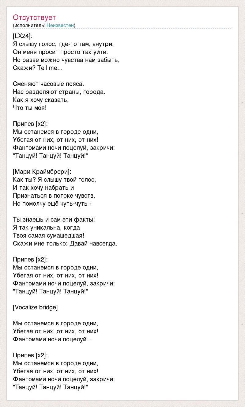 [LX24]: Я слышу голос, где-то там, внутри. Он меня просит просто так уйти. Но разве можно чувства нам забыть, Скажи? Tell me... Сменяют часовые пояса. Нас разделяют страны, города. Как я хочу сказать, Что ты моя! Припев [x2]: Мы останемся в городе одни, Убегая от них, от них, от них! Фантомами ночи поцелуй, закричи: "Танцуй! Танцуй! Танцуй!" [Мари Краймбрери]: Как ты? Я слышу твой голос, И так хочу набрать и Признаться в потоке чувств, Но помолчу ещё чуть-чуть - Ты знаешь и сам эти факты! Я так уникальна, когда Твоя самая сумашедшая! Скажи мне только: Давай навсегда. Припев [x2]: Мы останемся в городе одни, Убегая от них, от них, от них! Фантомами ночи поцелуй, закричи: "Танцуй! Танцуй! Танцуй!" [Vocalize bridge] Мы останемся в городе одни, Убегая от них, от них, от них! Фантомами ночи поцелуй... Припев [x2]: Мы останемся в городе одни, Убегая от них, от них, от них! Фантомами ночи поцелуй, закричи: "Танцуй! Танцуй! Танцуй!"
