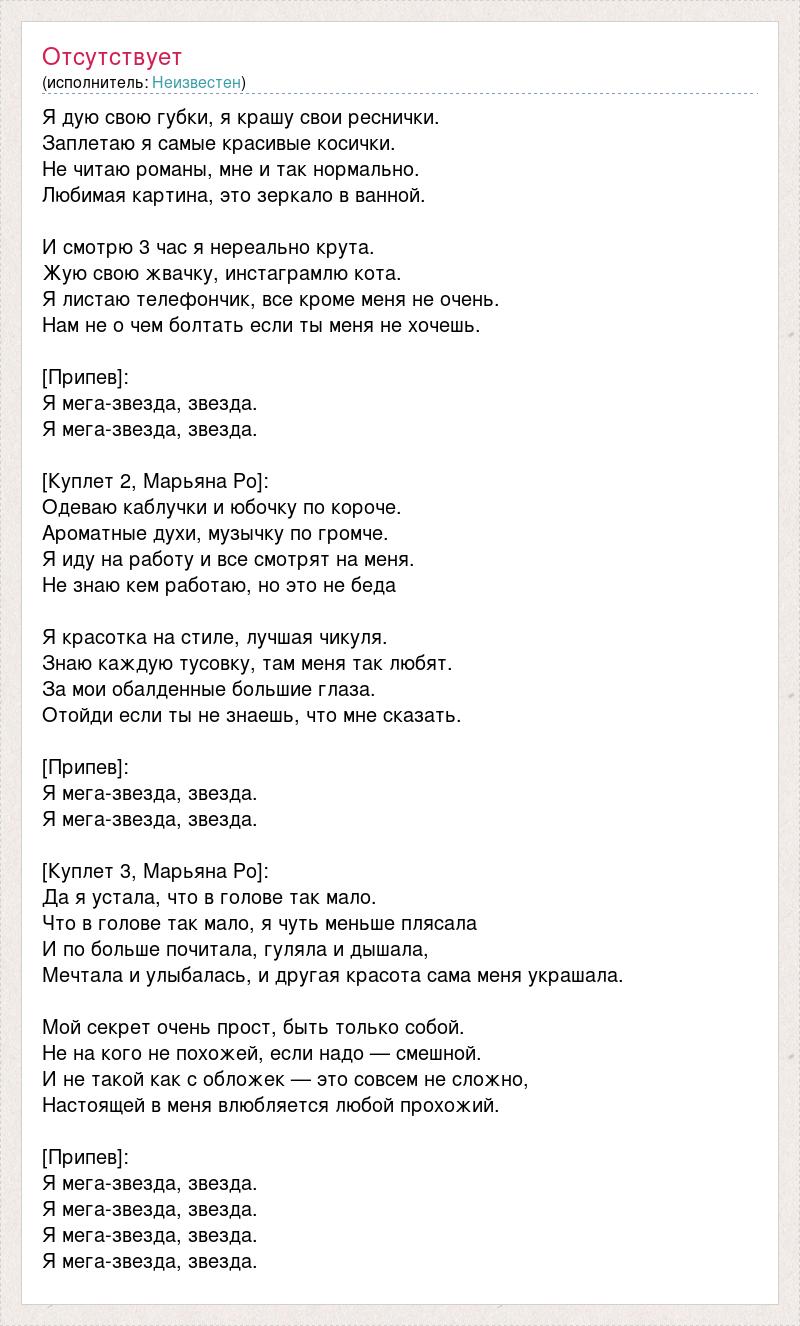 Я дую свою губки, я крашу свои реснички. Заплетаю я самые красивые косички. Не читаю романы, мне и так нормально. Любимая картина, это зеркало в ванной. И смотрю 3 час я нереально крута. Жую свою жвачку, инстаграмлю кота. Я листаю телефончик, все кроме меня не очень. Нам не о чем болтать если ты меня не хочешь. [Припев]: Я мега-звезда, звезда. Я мега-звезда, звезда. [Куплет 2, Марьяна Ро]: Одеваю каблучки и юбочку по короче. Ароматные духи, музычку по громче. Я иду на работу и все смотрят на меня. Не знаю кем работаю, но это не беда Я красотка на стиле, лучшая чикуля. Знаю каждую тусовку, там меня так любят. За мои обалденные большие глаза. Отойди если ты не знаешь, что мне сказать. [Припев]: Я мега-звезда, звезда. Я мега-звезда, звезда. [Куплет 3, Марьяна Ро]: Да я устала, что в голове так мало. Что в голове так мало, я чуть меньше плясала И по больше почитала, гуляла и дышала, Мечтала и улыбалась, и другая красота сама меня украшала. Мой секрет очень прост, быть только собой. Не на кого не похожей, если надо — смешной. И не такой как с обложек — это совсем не сложно, Настоящей в меня влюбляется любой прохожий. [Припев]: Я мега-звезда, звезда. Я мега-звезда, звезда. Я мега-звезда, звезда. Я мега-звезда, звезда.