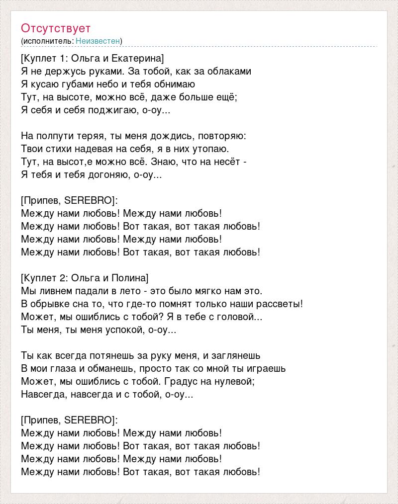 [Куплет 1: Ольга и Екатерина] Я не держусь руками. За тобой, как за облаками Я кусаю губами небо и тебя обнимаю Тут, на высоте, можно всё, даже больше ещё; Я себя и себя поджигаю, о-оу... На полпути теряя, ты меня дождись, повторяю: Твои стихи надевая на себя, я в них утопаю. Тут, на высот,е можно всё. Знаю, что на несёт - Я тебя и тебя догоняю, о-оу... [Припев, SEREBRO]: Между нами любовь! Между нами любовь! Между нами любовь! Вот такая, вот такая любовь! Между нами любовь! Между нами любовь! Между нами любовь! Вот такая, вот такая любовь! [Куплет 2: Ольга и Полина] Мы ливнем падали в лето - это было мягко нам это. В обрывке сна то, что где-то помнят только наши рассветы! Может, мы ошиблись с тобой? Я в тебе с головой... Ты меня, ты меня успокой, о-оу... Ты как всегда потянешь за руку меня, и заглянешь В мои глаза и обманешь, просто так со мной ты играешь Может, мы ошиблись с тобой. Градус на нулевой; Навсегда, навсегда и с тобой, о-оу... [Припев, SEREBRO]: Между нами любовь! Между нами любовь! Между нами любовь! Вот такая, вот такая любовь! Между нами любовь! Между нами любовь! Между нами любовь! Вот такая, вот такая любовь!