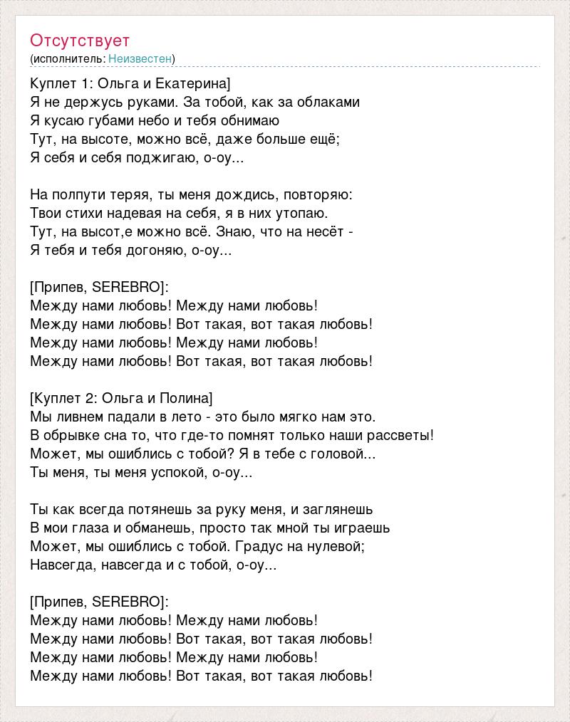 Куплет 1: Ольга и Екатерина] Я не держусь руками. За тобой, как за облаками Я кусаю губами небо и тебя обнимаю Тут, на высоте, можно всё, даже больше ещё; Я себя и себя поджигаю, о-оу... На полпути теряя, ты меня дождись, повторяю: Твои стихи надевая на себя, я в них утопаю. Тут, на высот,е можно всё. Знаю, что на несёт - Я тебя и тебя догоняю, о-оу... [Припев, SEREBRO]: Между нами любовь! Между нами любовь! Между нами любовь! Вот такая, вот такая любовь! Между нами любовь! Между нами любовь! Между нами любовь! Вот такая, вот такая любовь! [Куплет 2: Ольга и Полина] Мы ливнем падали в лето - это было мягко нам это. В обрывке сна то, что где-то помнят только наши рассветы! Может, мы ошиблись с тобой? Я в тебе с головой... Ты меня, ты меня успокой, о-оу... Ты как всегда потянешь за руку меня, и заглянешь В мои глаза и обманешь, просто так мной ты играешь Может, мы ошиблись с тобой. Градус на нулевой; Навсегда, навсегда и с тобой, о-оу... [Припев, SEREBRO]: Между нами любовь! Между нами любовь! Между нами любовь! Вот такая, вот такая любовь! Между нами любовь! Между нами любовь! Между нами любовь! Вот такая, вот такая любовь!