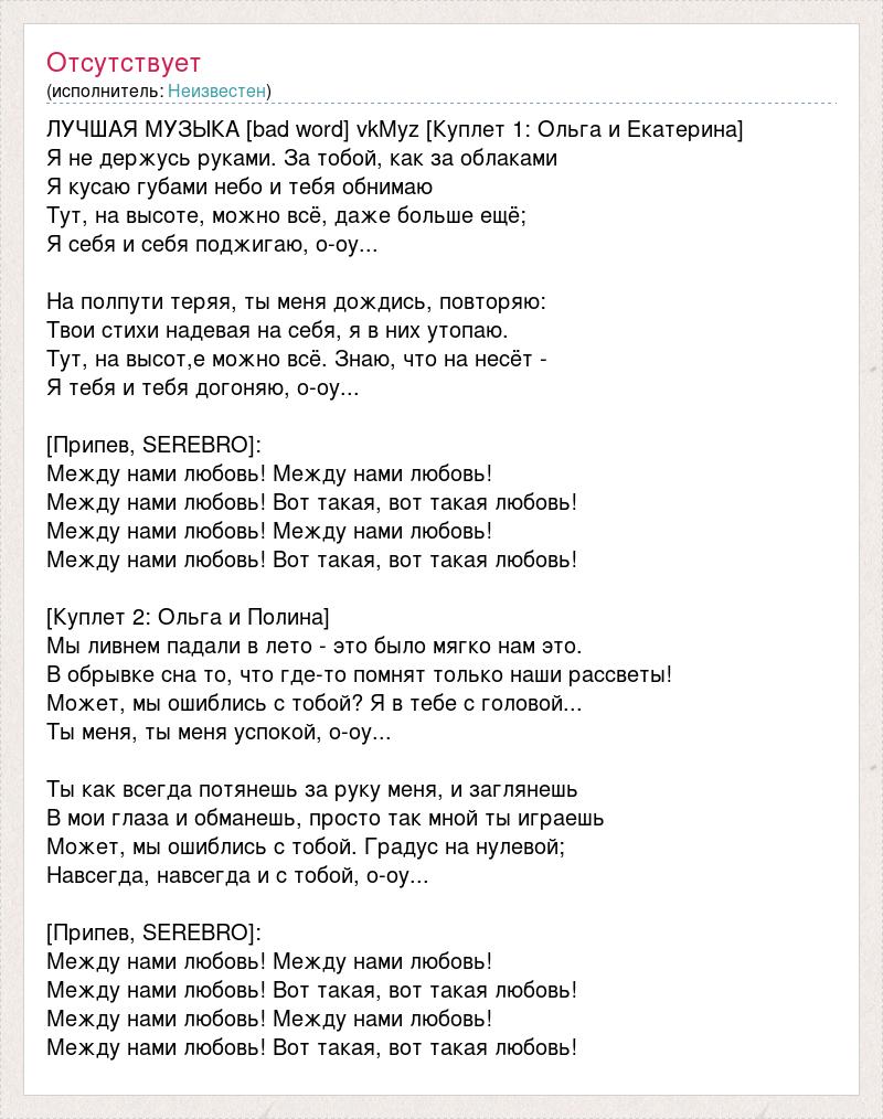 ЛУЧШАЯ МУЗЫКА [bad word] vkMyz [Куплет 1: Ольга и Екатерина] Я не держусь руками. За тобой, как за облаками Я кусаю губами небо и тебя обнимаю Тут, на высоте, можно всё, даже больше ещё; Я себя и себя поджигаю, о-оу... На полпути теряя, ты меня дождись, повторяю: Твои стихи надевая на себя, я в них утопаю. Тут, на высот,е можно всё. Знаю, что на несёт - Я тебя и тебя догоняю, о-оу... [Припев, SEREBRO]: Между нами любовь! Между нами любовь! Между нами любовь! Вот такая, вот такая любовь! Между нами любовь! Между нами любовь! Между нами любовь! Вот такая, вот такая любовь! [Куплет 2: Ольга и Полина] Мы ливнем падали в лето - это было мягко нам это. В обрывке сна то, что где-то помнят только наши рассветы! Может, мы ошиблись с тобой? Я в тебе с головой... Ты меня, ты меня успокой, о-оу... Ты как всегда потянешь за руку меня, и заглянешь В мои глаза и обманешь, просто так мной ты играешь Может, мы ошиблись с тобой. Градус на нулевой; Навсегда, навсегда и с тобой, о-оу... [Припев, SEREBRO]: Между нами любовь! Между нами любовь! Между нами любовь! Вот такая, вот такая любовь! Между нами любовь! Между нами любовь! Между нами любовь! Вот такая, вот такая любовь!
