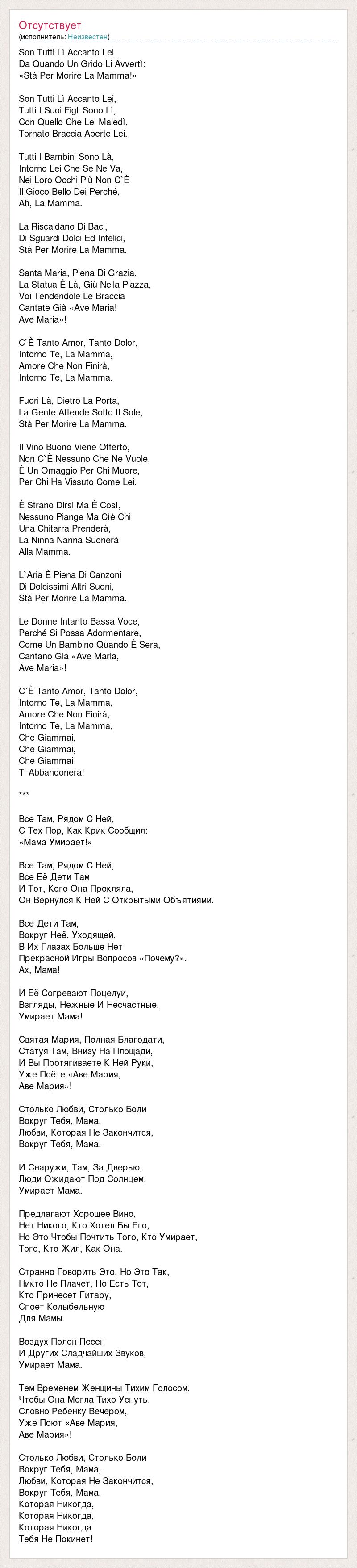 Son Tutti Lì Accanto Lei Da Quando Un Grido Li Avvertì: «Stà Per Morire La Mamma!» Son Tutti Lì Accanto Lei, Tutti I Suoi Figli Sono Lì, Con Quello Che Lei Maledì, Tornato Braccia Aperte Lei. Tutti I Bambini Sono Là, Intorno Lei Che Se Ne Va, Nei Loro Occhi Più Non C`È Il Gioco Bello Dei Perché, Ah, La Mamma. La Riscaldano Di Baci, Di Sguardi Dolci Ed Infelici, Stà Per Morire La Mamma. Santa Maria, Piena Di Grazia, La Statua È Là, Giù Nella Piazza, Voi Tendendole Le Braccia Cantate Già «Ave Maria! Ave Maria»! C`È Tanto Amor, Tanto Dolor, Intorno Te, La Mamma, Amore Che Non Finirà, Intorno Te, La Mamma. Fuori Là, Dietro La Porta, La Gente Attende Sotto Il Sole, Stà Per Morire La Mamma. Il Vino Buono Viene Offerto, Non C`È Nessuno Che Ne Vuole, È Un Omaggio Per Chi Muore, Per Chi Ha Vissuto Come Lei. È Strano Dirsi Ma È Così, Nessuno Piange Ma Cìè Chi Una Chitarra Prenderà, La Ninna Nanna Suonerà Alla Mamma. L`Aria È Piena Di Canzoni Di Dolcissimi Altri Suoni, Stà Per Morire La Mamma. Le Donne Intanto Bassa Voce, Perché Si Possa Adormentare, Come Un Bambino Quando È Sera, Cantano Già «Ave Maria, Ave Maria»! C`È Tanto Amor, Tanto Dolor, Intorno Te, La Mamma, Amore Che Non Finirà, Intorno Te, La Mamma, Che Giammai, Che Giammai, Che Giammai Ti Abbandonerà! *** Все Там, Рядом С Ней, С Тех Пор, Как Крик Сообщил: «Мама Умирает!» Все Там, Рядом С Ней, Все Её Дети Там И Тот, Кого Она Прокляла, Он Вернулся К Ней С Открытыми Объятиями. Все Дети Там, Вокруг Неё, Уходящей, В Их Глазах Больше Нет Прекрасной Игры Вопросов «Почему?». Ах, Мама! И Её Согревают Поцелуи, Взгляды, Нежные И Несчастные, Умирает Мама! Святая Мария, Полная Благодати, Статуя Там, Внизу На Площади, И Вы Протягиваете К Ней Руки, Уже Поёте «Аве Мария, Аве Мария»! Столько Любви, Столько Боли Вокруг Тебя, Мама, Любви, Которая Не Закончится, Вокруг Тебя, Мама. И Снаружи, Там, За Дверью, Люди Ожидают Под Солнцем, Умирает Мама. Предлагают Хорошее Вино, Нет Никого, Кто Хотел Бы Его, Но Это Чтобы Почтить Того, Кто Умирает, Того, Кто Жил, Как Она. Странно Говорить Это, Но Это Так, Никто Не Плачет, Но Есть Тот, Кто Принесет Гитару, Споет Колыбельную Для Мамы. Воздух Полон Песен И Других Сладчайших Звуков, Умирает Мама. Тем Временем Женщины Тихим Голосом, Чтобы Она Могла Тихо Уснуть, Словно Ребенку Вечером, Уже Поют «Аве Мария, Аве Мария»! Столько Любви, Столько Боли Вокруг Тебя, Мама, Любви, Которая Не Закончится, Вокруг Тебя, Мама, Которая Никогда, Которая Никогда, Которая Никогда Тебя Не Покинет!